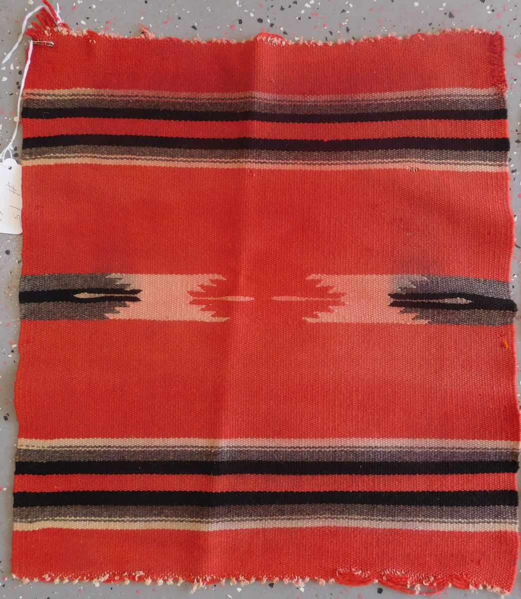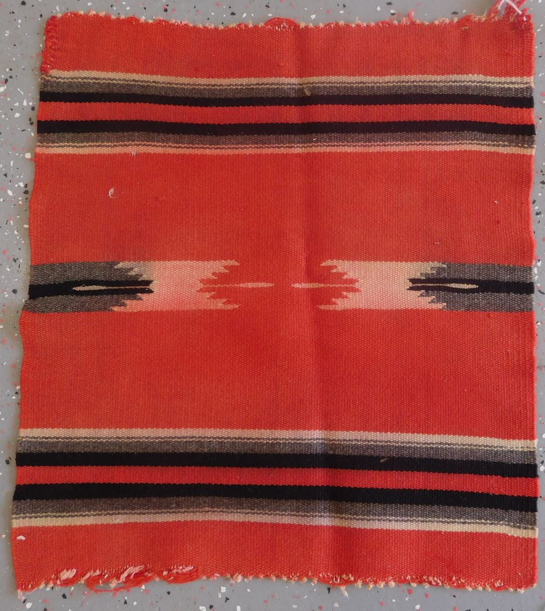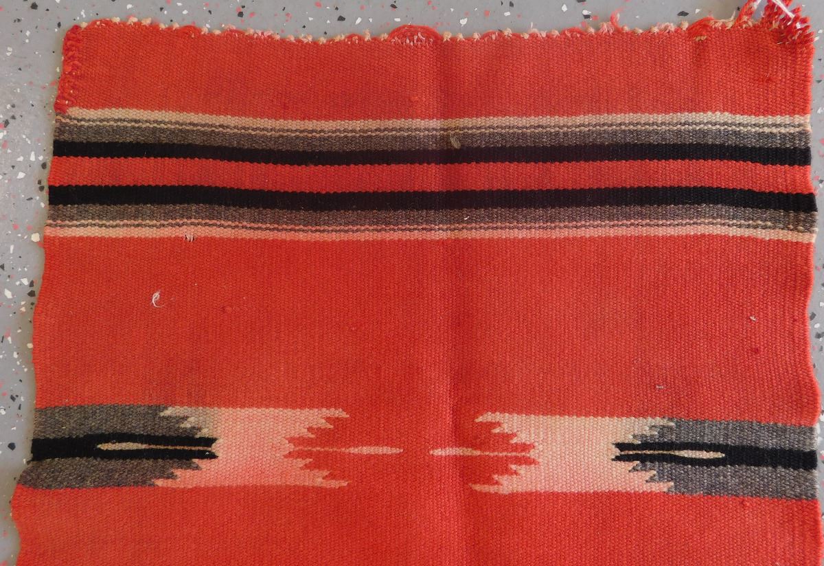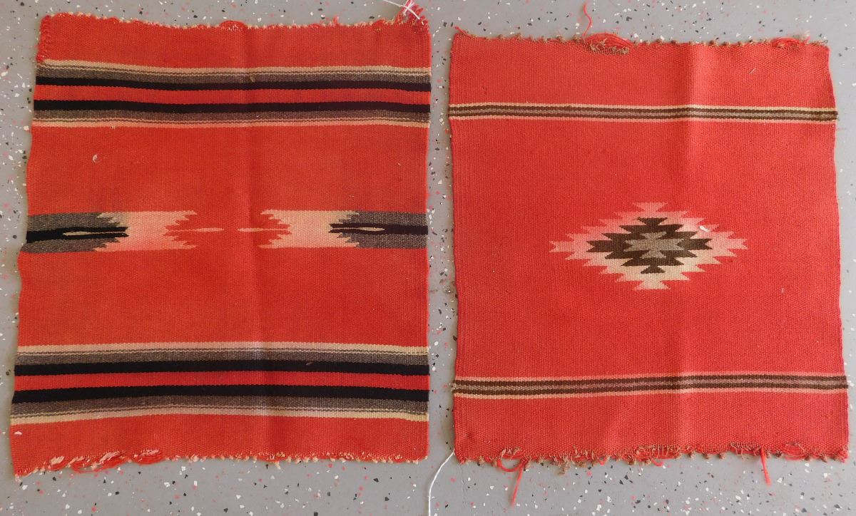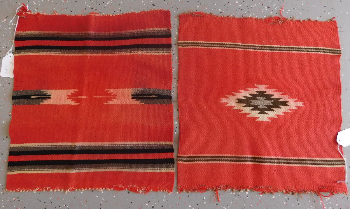 Two Germantown Chimayos, circa 1920s. Items are made of wool and measure 17 x 19 and 17 x 9 inches. From North of Santa Fe, New Mexico. From an estate of a longtime collector. Condition: There is some wear and small holes and fading, see images. Shipping: $18.50.