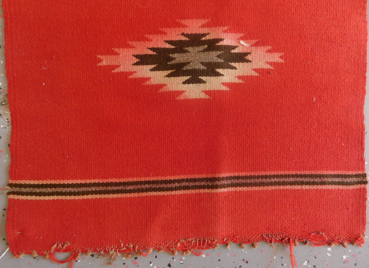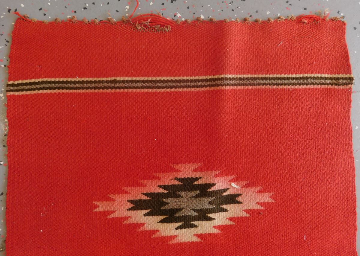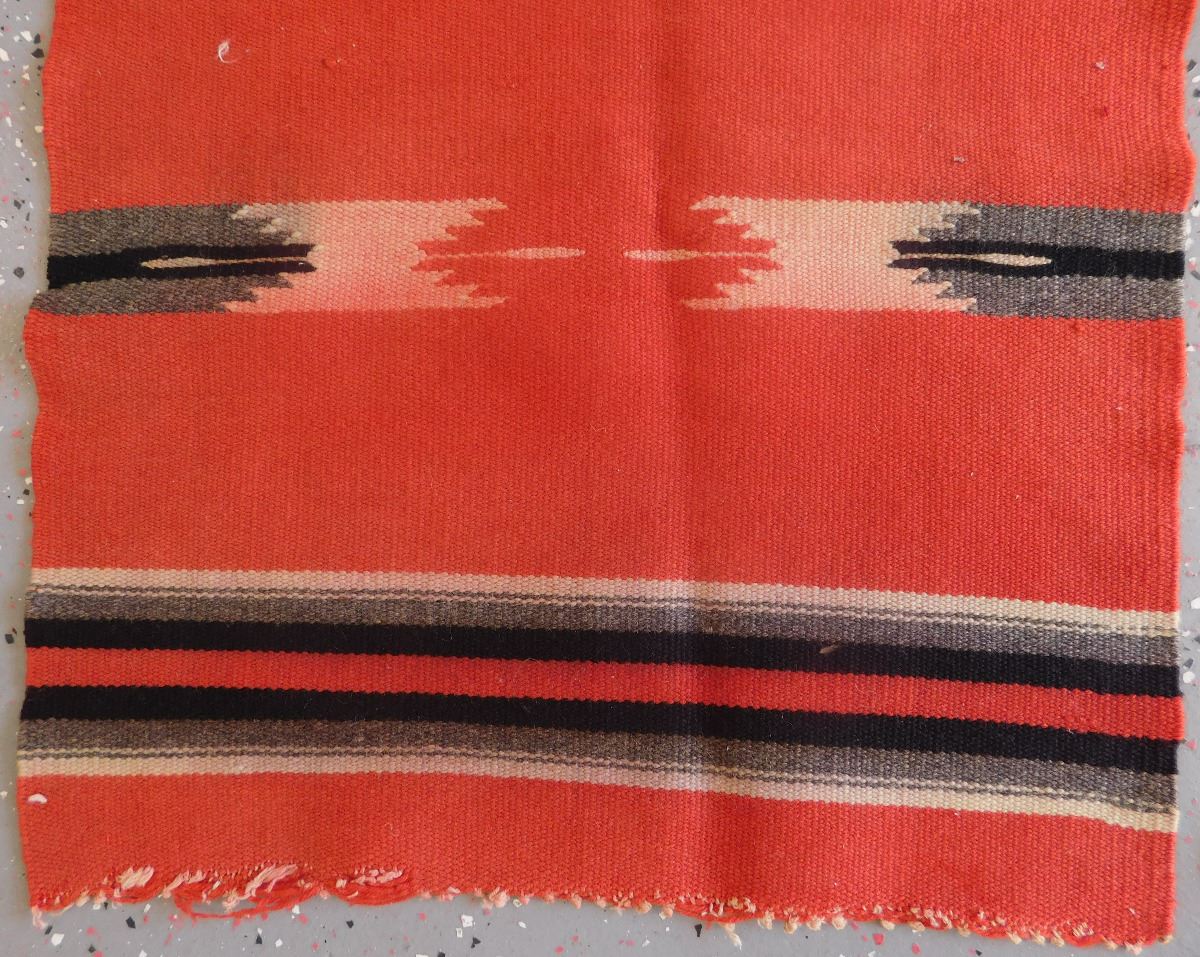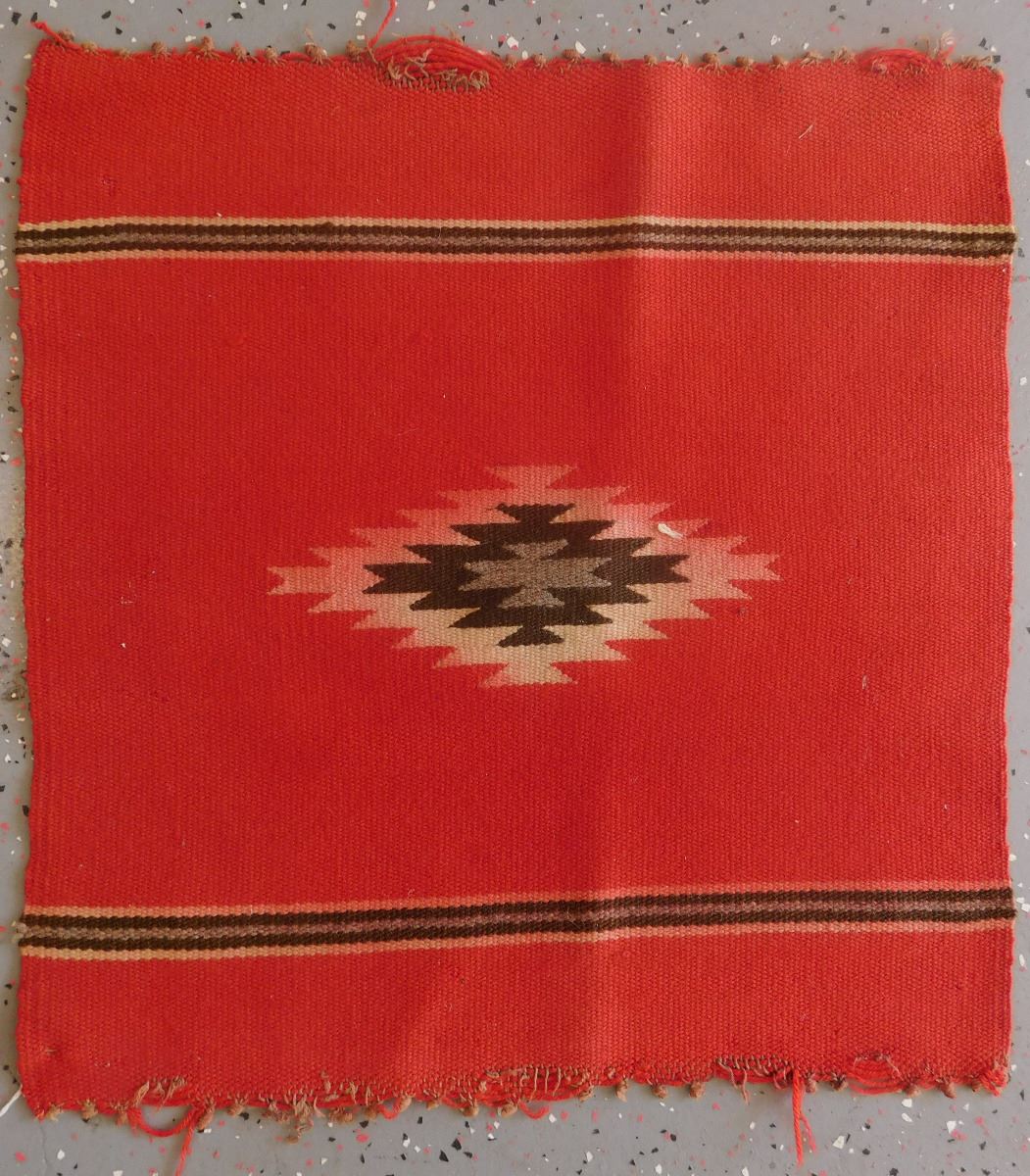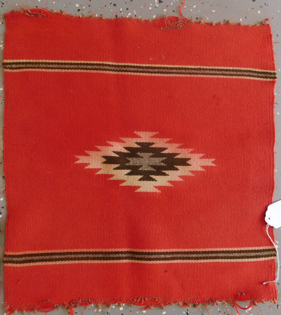 Two Germantown Chimayos, circa 1920s. Items are made of wool and measure 17 x 19 and 17 x 9 inches. From North of Santa Fe, New Mexico. From an estate of a longtime collector. Condition: There is some wear and small holes and fading, see images. Shipping: $18.50.