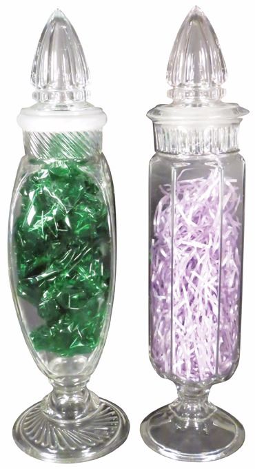 Two Glass Candy Display Jars. 19 1/2 inches tall. Swirl top chip on lip. Century chips on ground glass stopper.