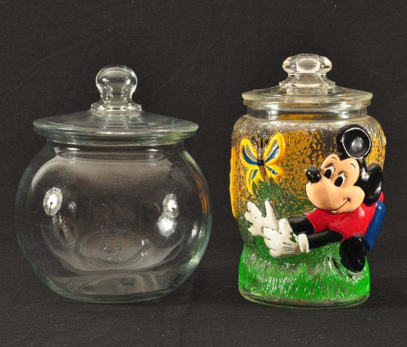 Two Glass Storage Jars. One has Mickey Mouse design.
