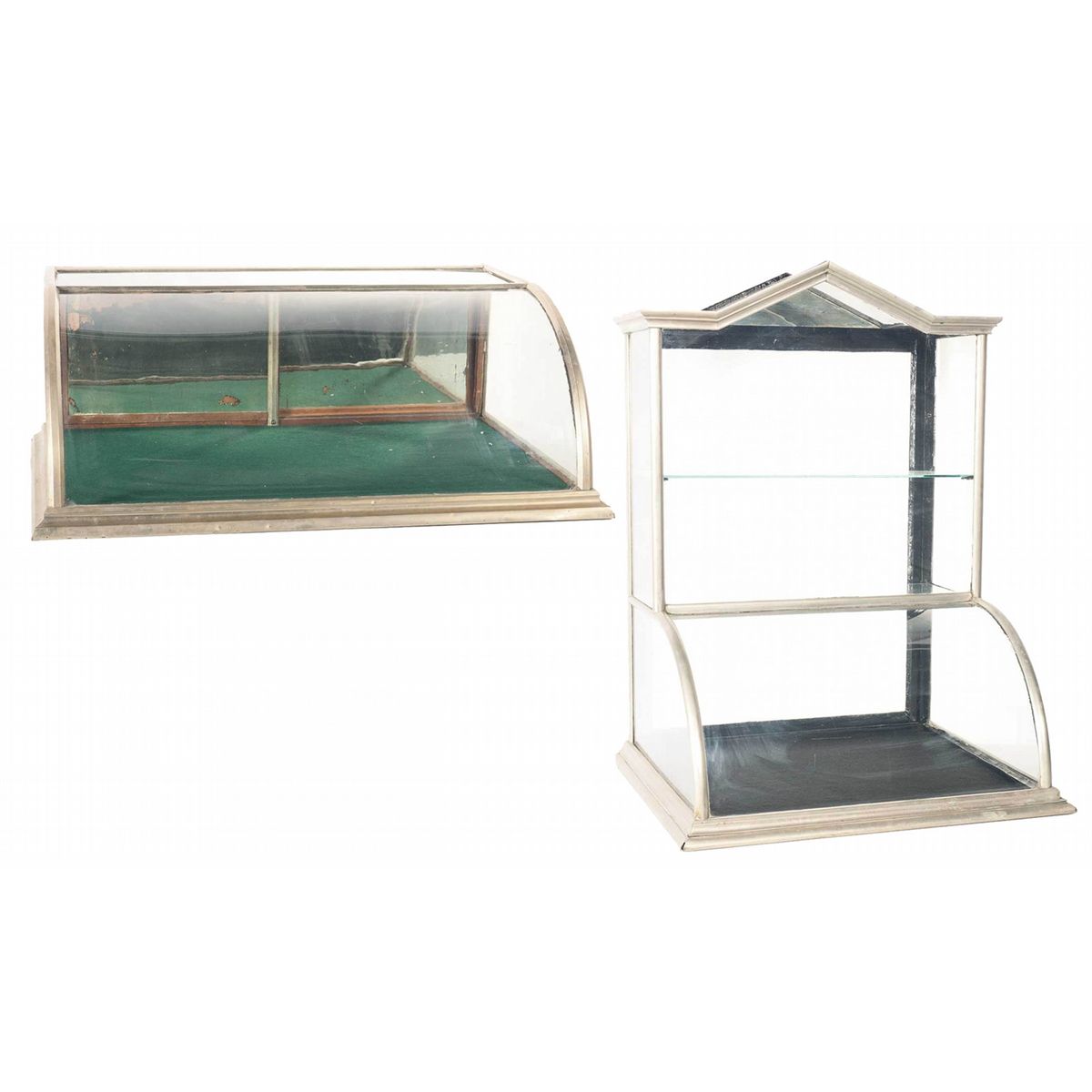 1) Curved front case, 13" t x 33 1/4" w x 24" d, silver plated. 2) Peaked front display case, 26 1/4" t x 25" w x 10 1/2" d, nickel façade. Padlockable door.