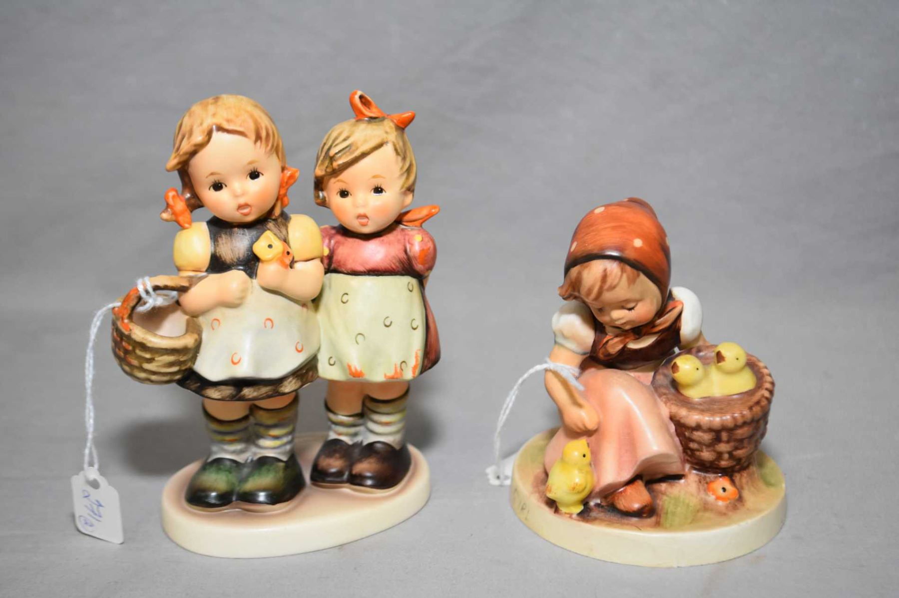 Two Goebel Hummel figures including "Daddy's Girls" and girl feeding chicks with full bee mark