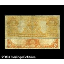 Two Gold Certificates. A Ten Dollar Fr. 1173 grading Ab <B>Two Gold Certificates.</B></I> A Ten Dollar Fr. 1173 grading <B>About Very Fine</B></I> with some surface soil and a 1906 $20 Fr. 1181 grading <B>Fine,</B></I> with a small portion of a purple bank stamp.<BR><I>From the collection of Stanley M. Zurawski, Jr.</B></I><BR> 2 notes <BR><BR><B>Important notice:</B> Heritage usually auctions material at the rate of 200-250 lots per hour. On some occasions eBay Live bid software or the Internet may not be able to keep up with the pace of the auction. We recommend placing a realistic absentee bid now as insurance to avoid disappointment. Occasionally the auctioneer may eliminate or reject an eBay Live bid, and the auctioneer may also reopen a lot after the close of the eBay live bidding (usually because we missed an audience bid), and may reject your bid even if it shows you as the winning bidder. By bidding via eBay Live, you agree that Heritage may award the lot to another bidder at its sole discretion under the circumstances described above or any other reasonable circumstances. Since eBay bids are not shown to us until we open the lot on the floor, we treat those bids just like floor bids. In most cases the floor responds before the eBay bid is presented to us, due to Internet lag time, so for consistency we have made it a policy that floor bids are always considered first over tie eBay live bids. Also please note that all Heritage lots purchased through eBay Live carry a 20% Buyer's Premium. Please make sure you read the Terms and Conditions before you bid. This lot is being auctioned in conjunction with a live floor auction by Heritage Galleries & Auctioneers. All final auction and invoice information will be supplied by Heritage Galleries & Auctioneers, and all other information should be considered preliminary. Lot:17900