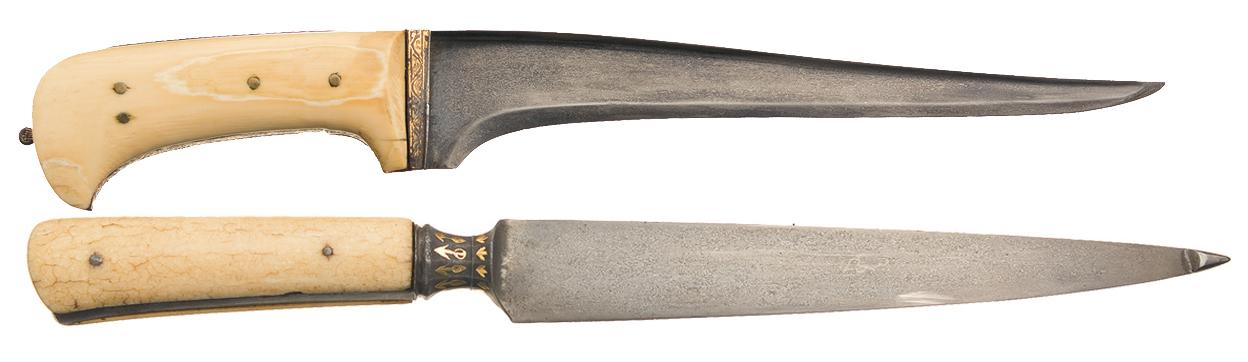 1) Pesk-Kabz dagger, 8 1/2" Damascus pattern blade with wide, flat spine. The hilt is decorated with gold inlaid vine and flower designs, with a pair of smooth ivory grips. OAL: 13" 2) Damascus bladed dagger, 8 3/4" blade with reinforced tip and a ribbed spine with gold accents. Hilt is decorated with gold flowers around the neck, with smooth bone grips. OAL: 13 3/4"