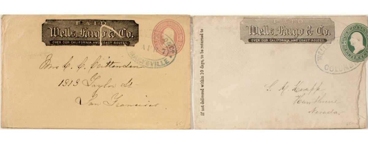 1) Cover addressed to Knapp in Hawthorne, Nevada. Blue oval Wells Fargo stamp for Columbia. Green 3 cent printed postage. 2) Cover addressed to San Francisco. Blue oval Wells Fargo stamp for Marysville. Pink 3 cent printed postage. (Prag Collection)