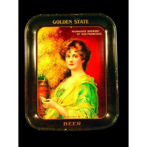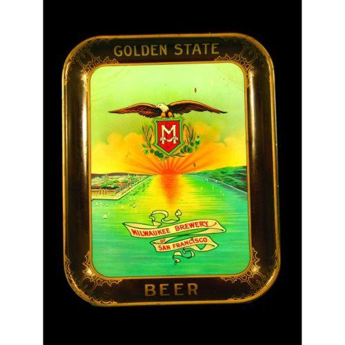 Two Golden State Beer Tin Serving Trays, Milwaukee Brewing Co., San Francisco, California, A pretty Lady with nail hole and scratch at 12:00, minor paint chips on the rim otherwise excellent condition. And one depicting an eagle holding a shield, a couple of paint chips otherwise excellent condition, Both 10 1/2 x 13 1/4 inches.