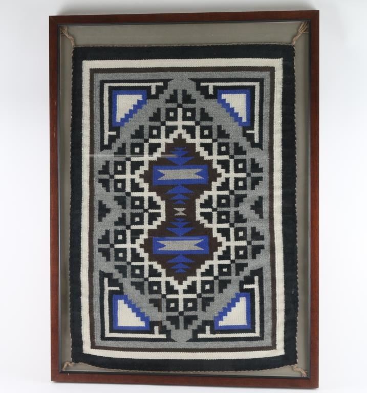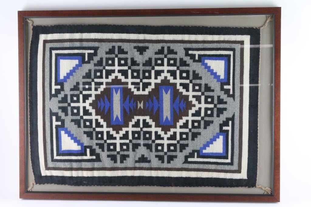 with gray, white, black, and cobalt blue. Made by Daisy Willie includes original purchase tag on back. Framed and measures 30"x21"