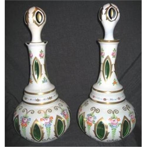 We are offering you two (2) Fantastic Hand Painted Cut to Green Bohemian Decanters. These decanters are hand painted with lovely floral pattern on a cut to green background. Each decanter is in SUPERIOR condition with no chips, cracks, or dings and each one measures 7" in diameer and stands a very stately 14" tall.
