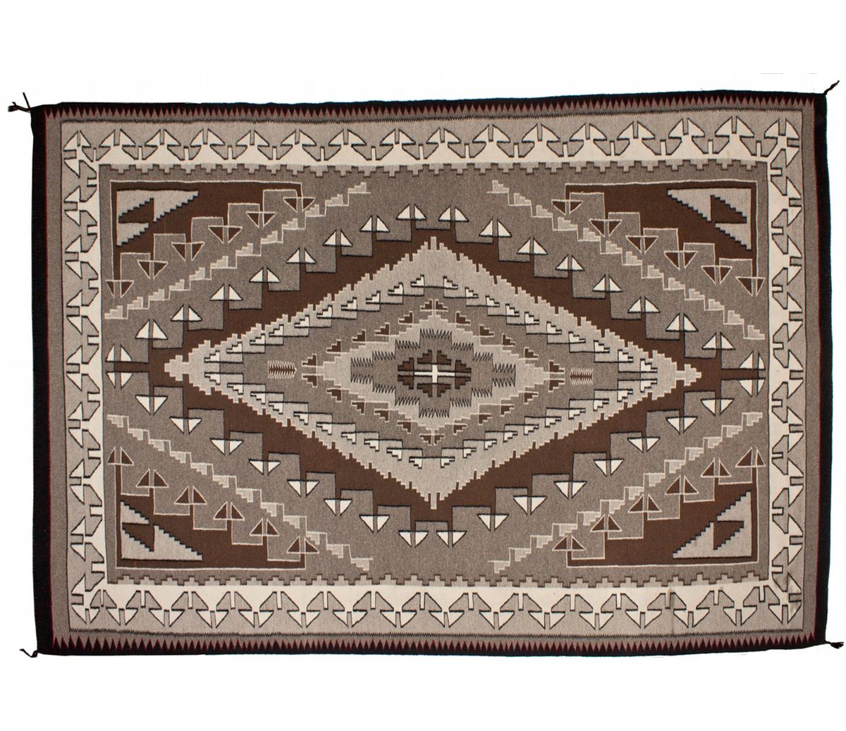A large wool rug measuring 86 x 120 in the Two Grey Hills style of muted earth tones. Natural dyes in colors of gray, brown, black, and natural. Black, gray, beige, brown, cream and white are the signature colors for a Toadalena/Two Grey Hills textile. This weaving is unusual in that the border is black with a serrated red edging. There is a small stain, perhaps water damage, on one corner. From the Tahoe Wovoka Estate Collection. Wovoka Collection HKA#63065