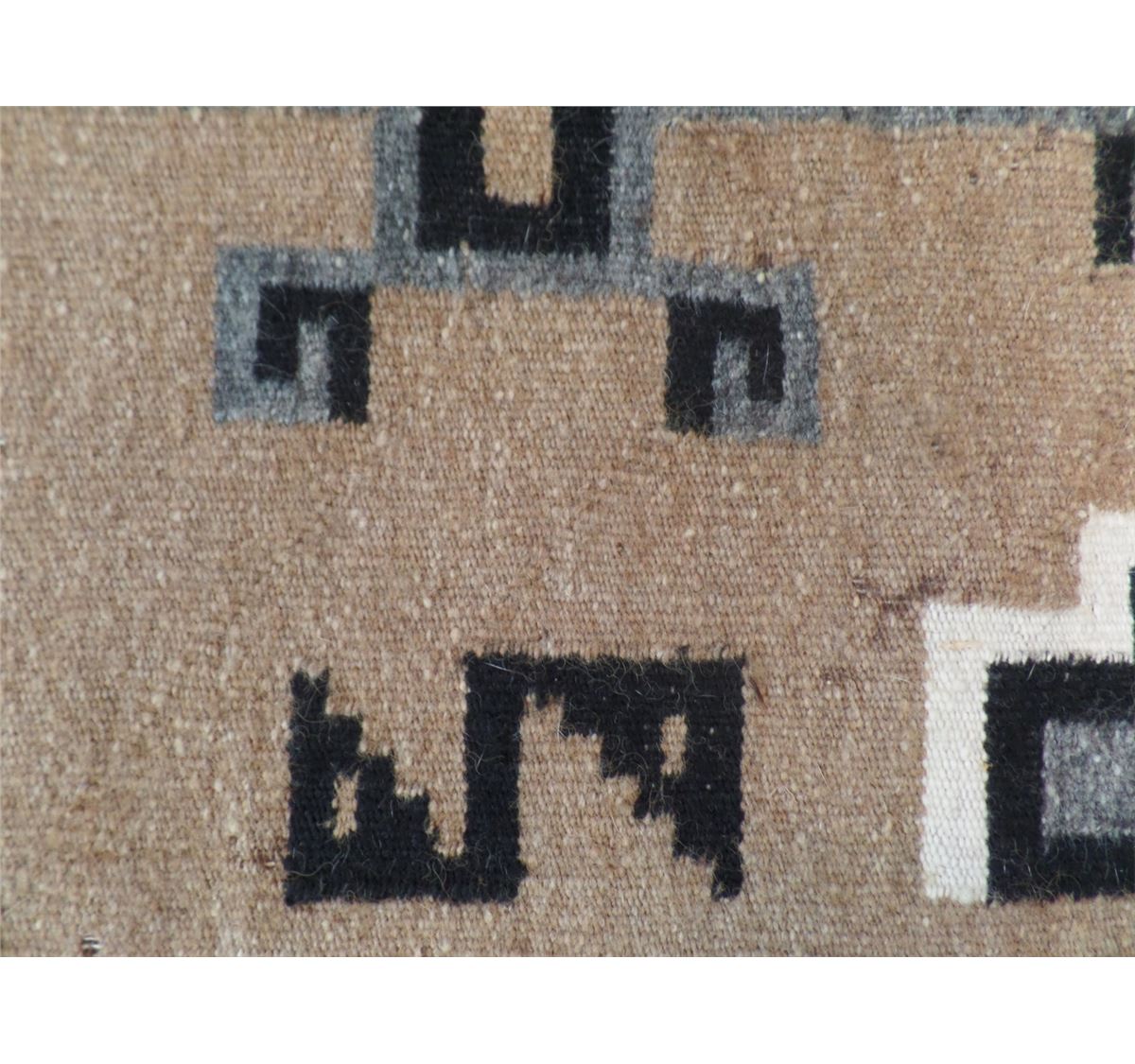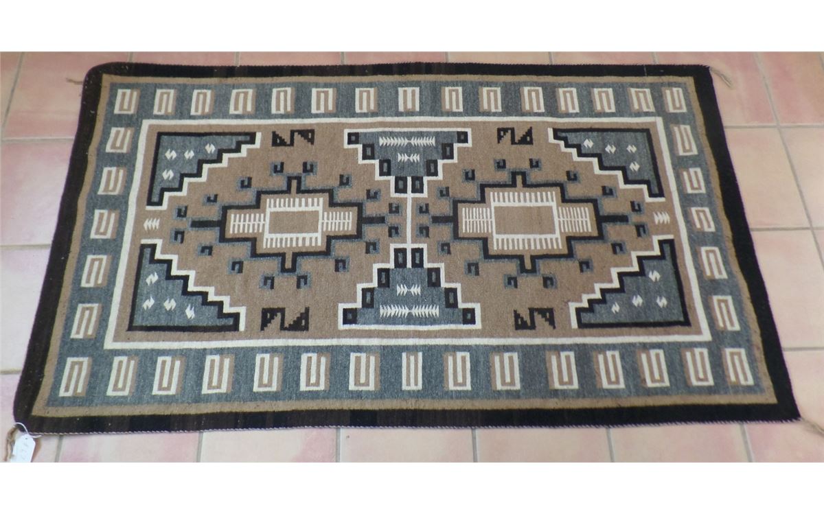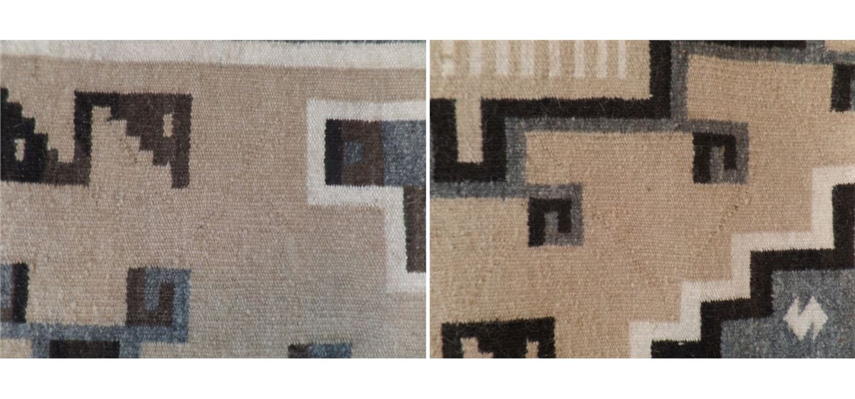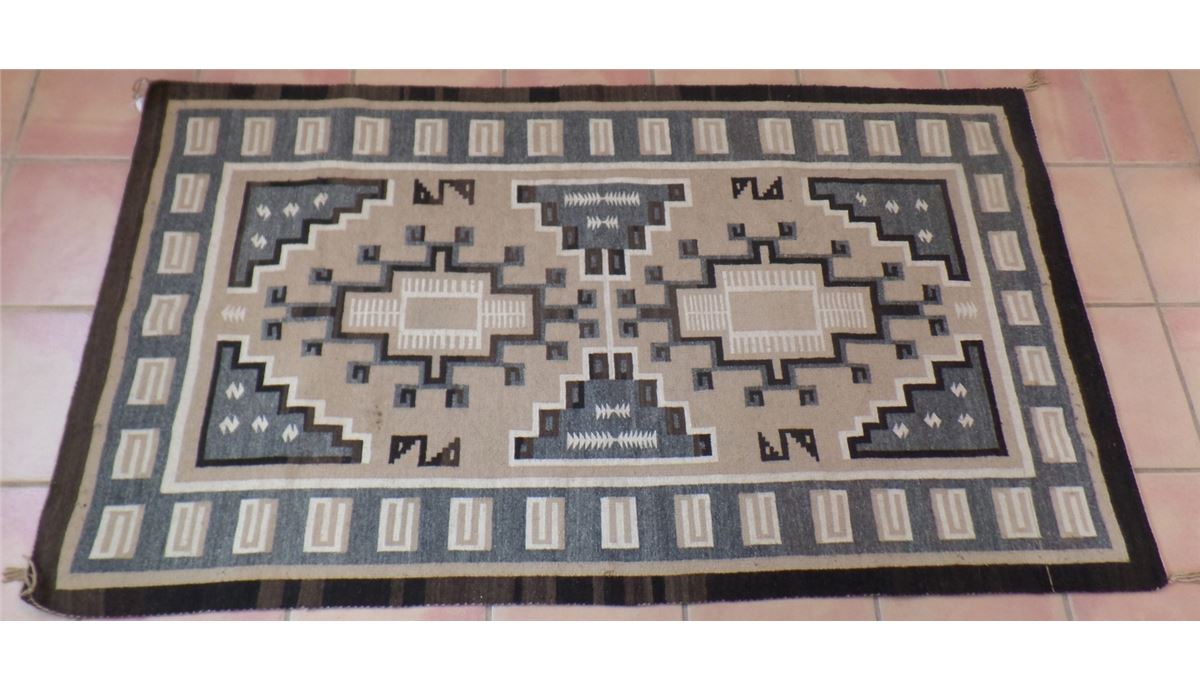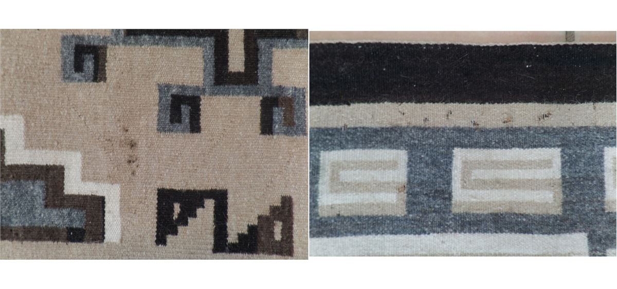 This Two Grey Hills Rug measures 70 1/2 x 39 1/2 inches. Some moth damage on approximately 15% of the rug. This rug is made from different dye lots of black and cream. Lazy lights and "S" Marks with Train Track design. Shipping: $30
