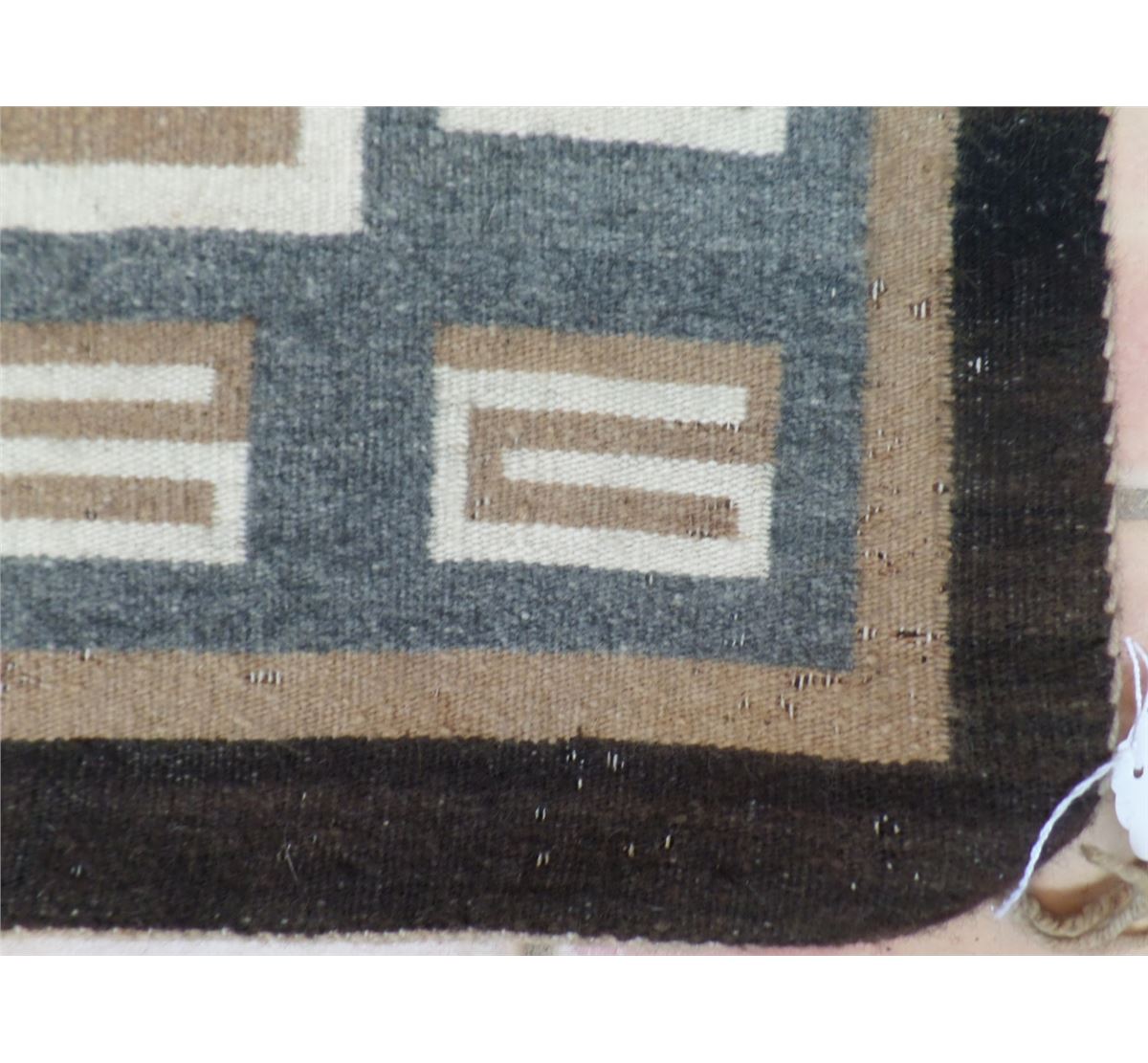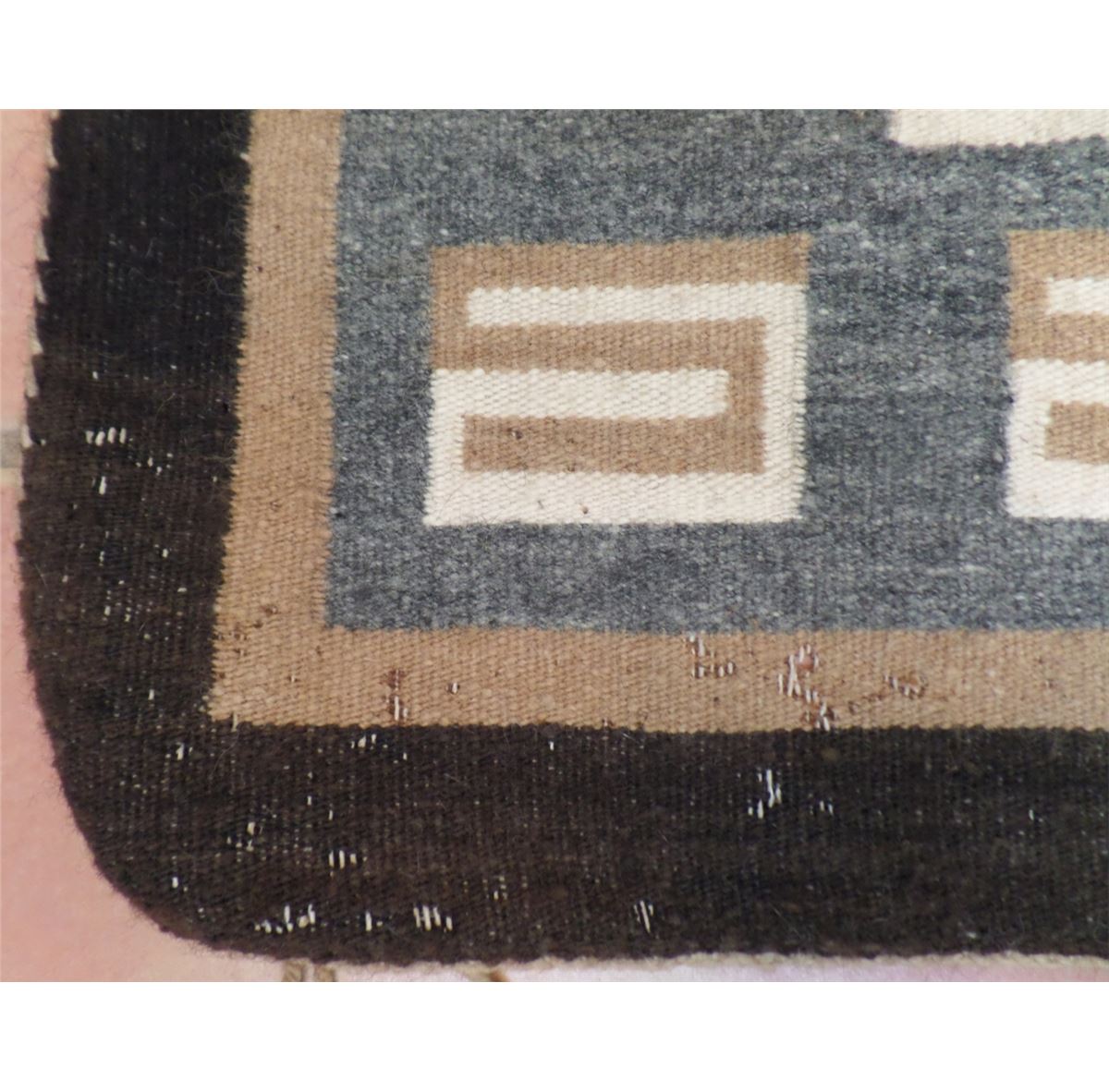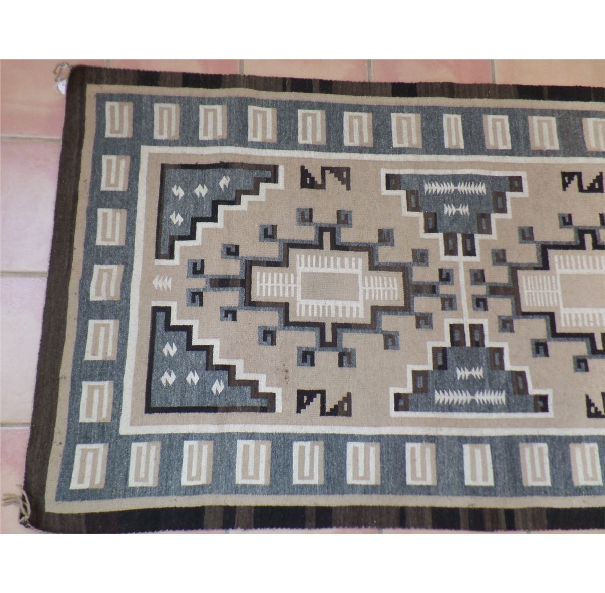 This Two Grey Hills Rug measures 70 1/2 x 39 1/2 inches. Some moth damage on approximately 15% of the rug. This rug is made from different dye lots of black and cream. Lazy lights and "S" Marks with Train Track design. Shipping: $30