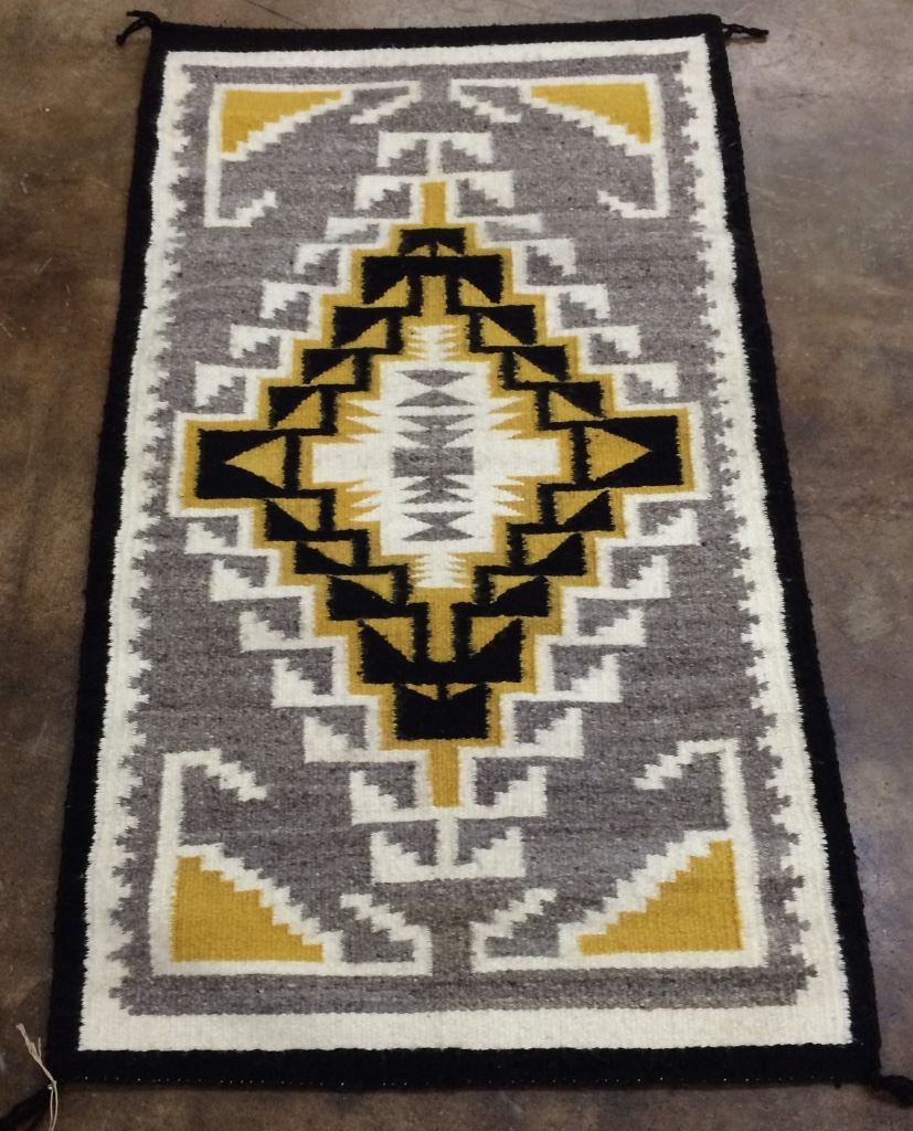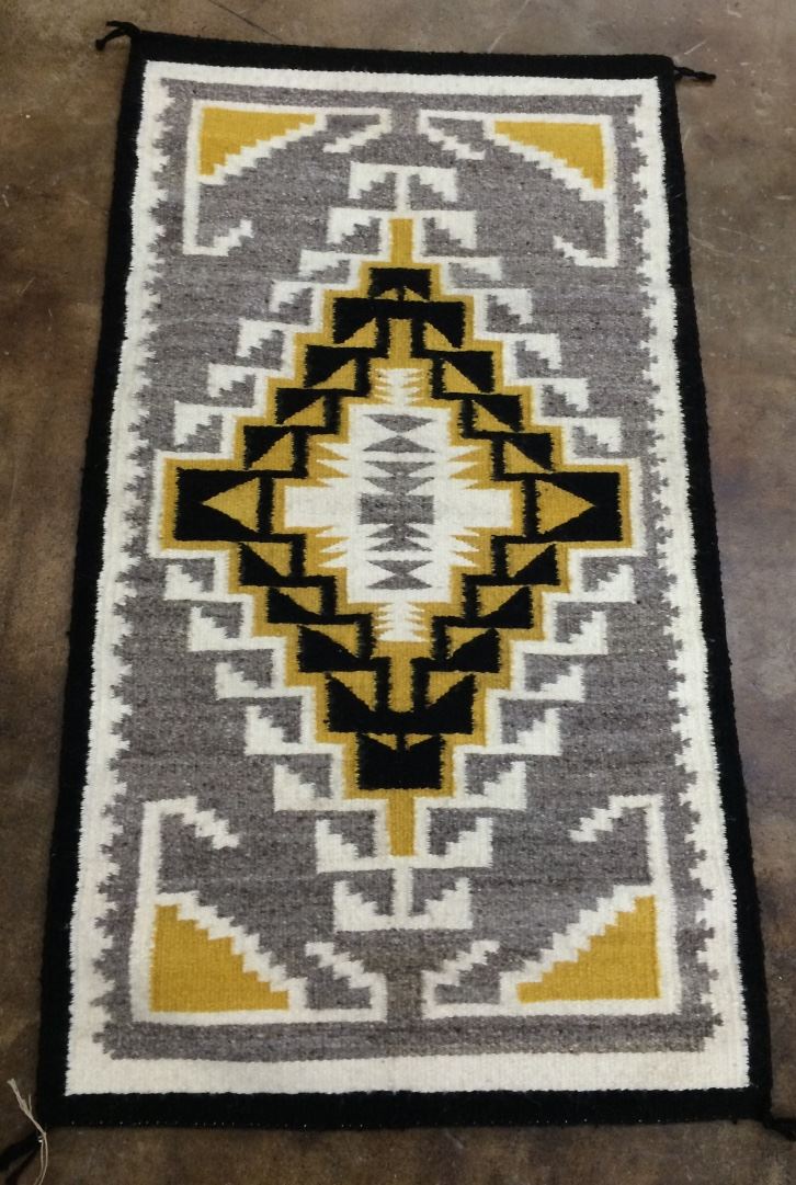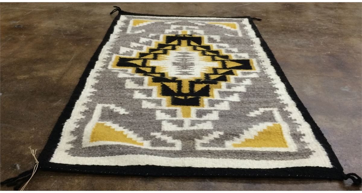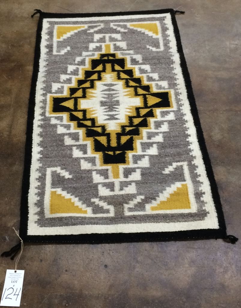 This older Two Grey Hills Navajo textile is in pretty good condition for its age. Please look at pics. Measures 25.5” X 45” overall. Shipping: There will be a $7 handling / packaging fee for shipping this lot. The actual cost of postage will be added on top of that.