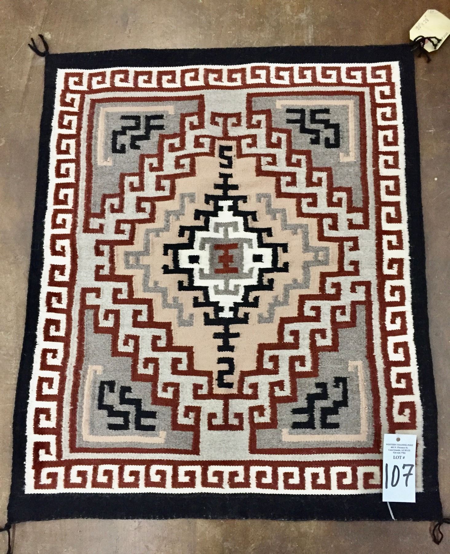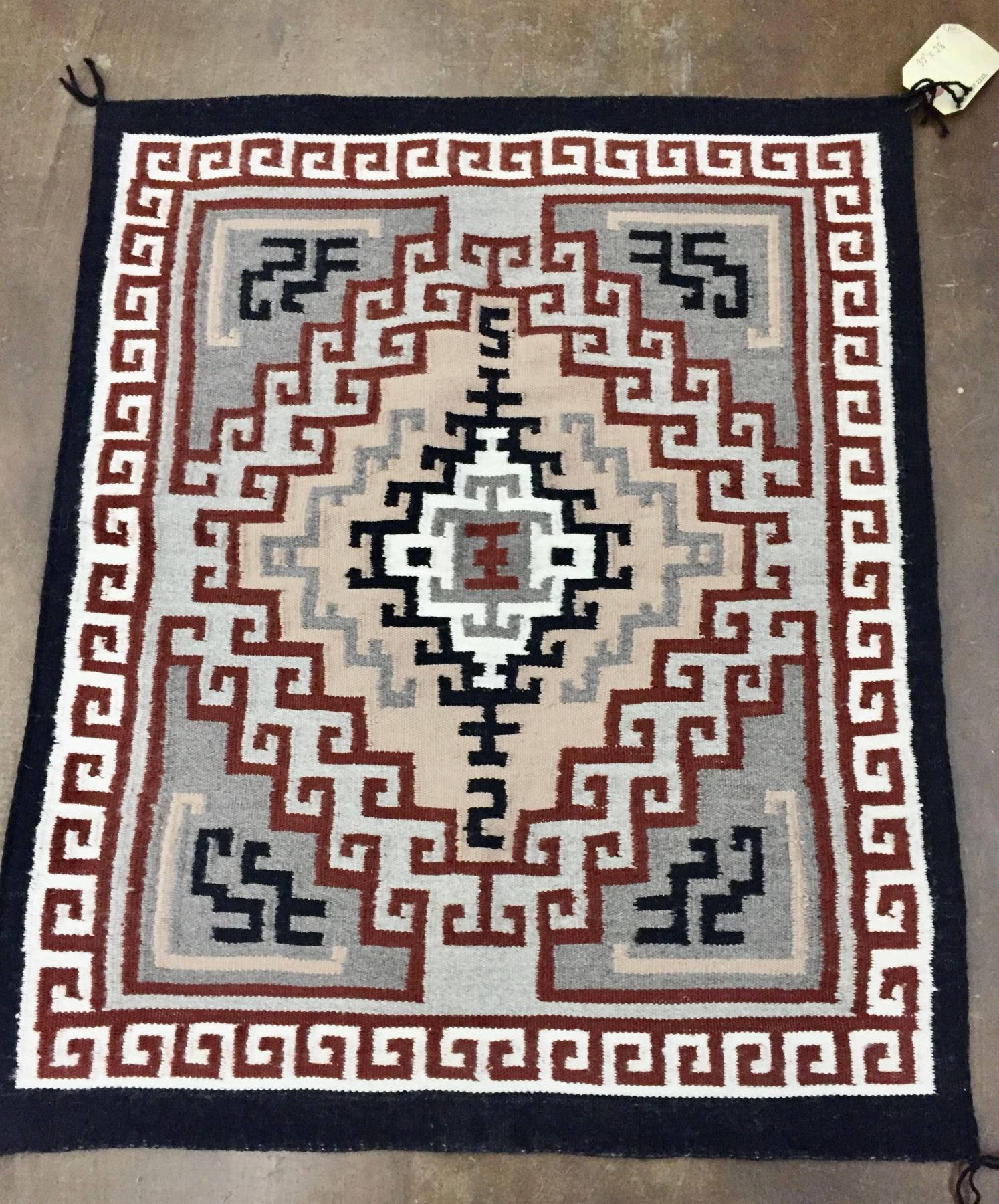 Description: Make a statement with this busy little Two Grey Hills textile. Features a diamond pattern in the center with tan, dark brown, white, gray, pale yellow and black colors. Maker: Unknown Navajo weaver. Approx. Age: Vintage. Size: 32”w x 28” long. Condition: Good for its age, normal wear expected. Please look closely at the pictures - they are an important part of our description. Shipping: There will be a $5 handling / packaging fee for shipping this lot. The actual cost of postage will be added on top of that.