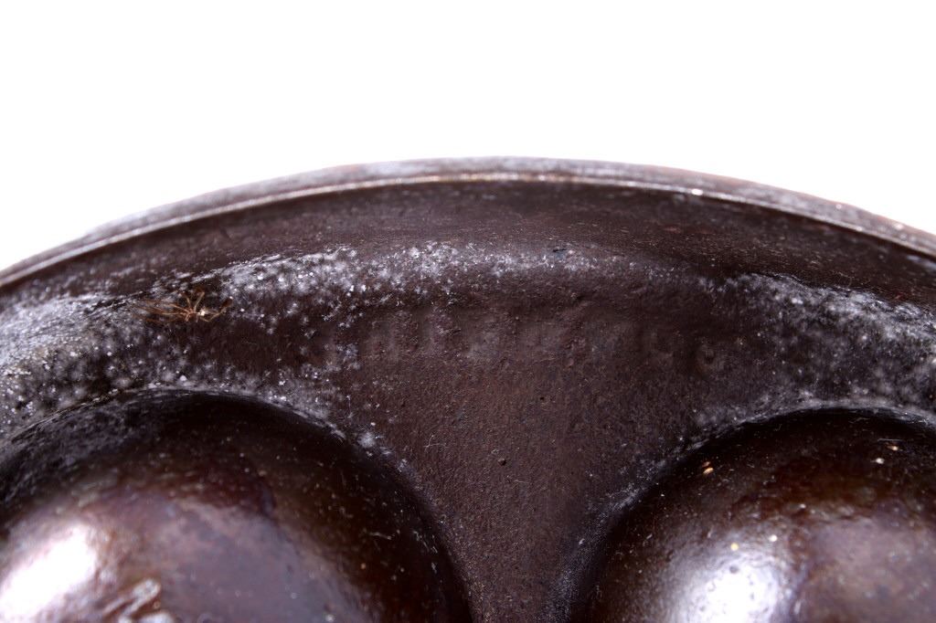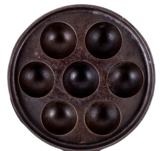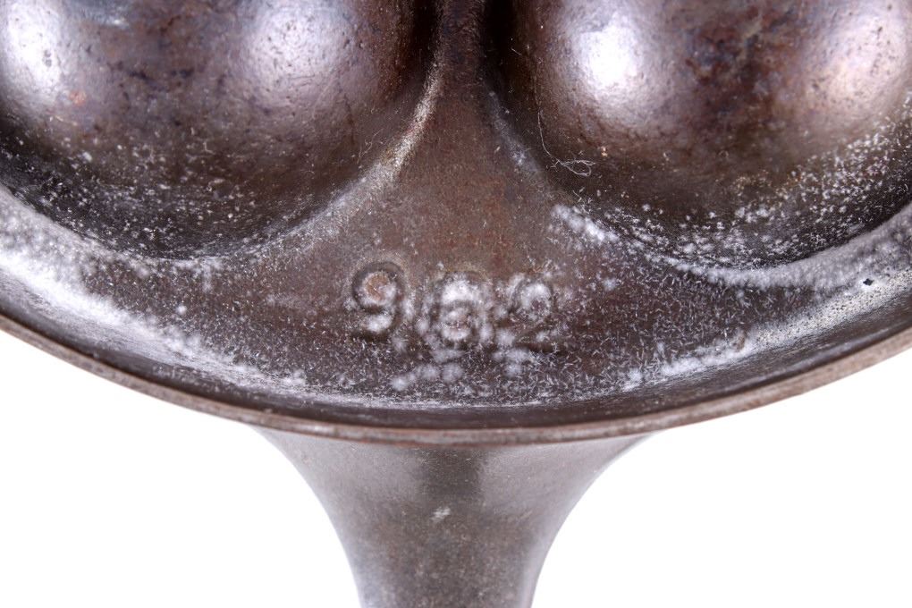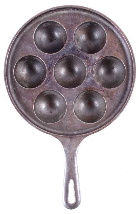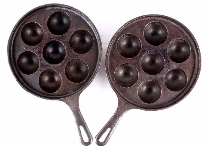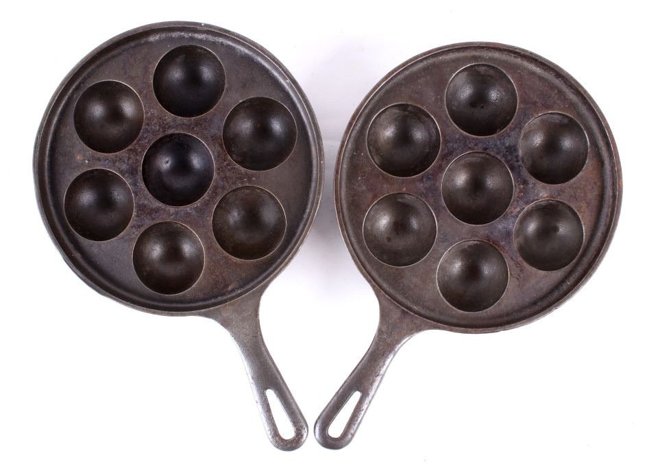 For your bidding consideration is this pair of Griswold cast iron Aebleskiver pans. These pans are also commonly called "egg poacher" pans. Aebleskivers (literally "apple slices" in Daish) are traditional Danish pancakes in the shape of a sphere. The pans are round with flat tops and 7 hemispherical batter "cups". The two pans come from different eras in the history of Griswold, as evidenced by the markings on the pan bottoms. The first pan is clearly marked "Griswold, Erie PA; it is further marked No. 32/ 962". This pan was made in the '30's to early '50's. on the bottom of the second pan, "Griswold" is more of a "ghost casting", being barley readable. "Erie PA" doesn't show up at all. In addition to "No. 32/ 962", "Made in USA". In 1957, when Griswold merged with Wagner Ware, manufacturing was shifted to the Wagner plant in Sidney, OH. Cookware made after '57 shows the "Griswold" name being phased out entirely. These pans are in very good condition; with proper cleaning and seasoning before use, you could surprise your family with a fun new-old breakfast food! The pans measure 1 3/4" tall x 9 1/4" in diameter; measuring at the handle, they are 14" long.