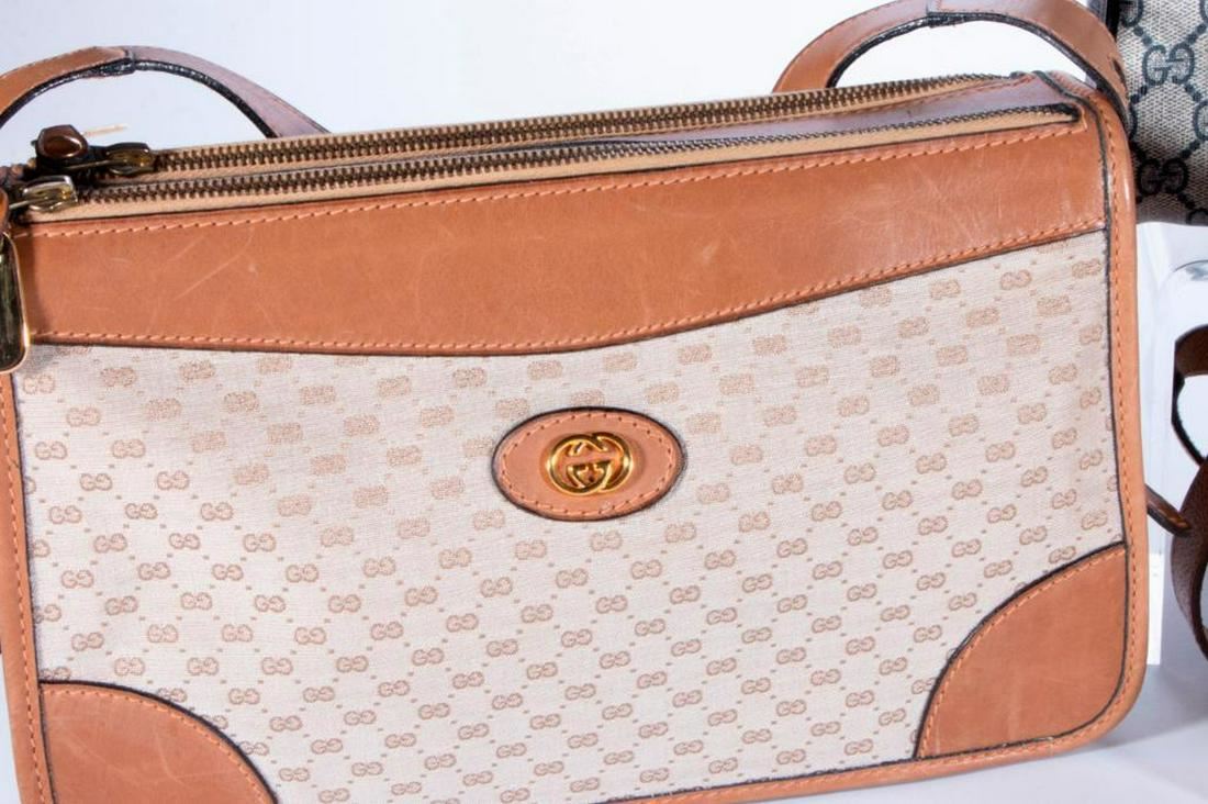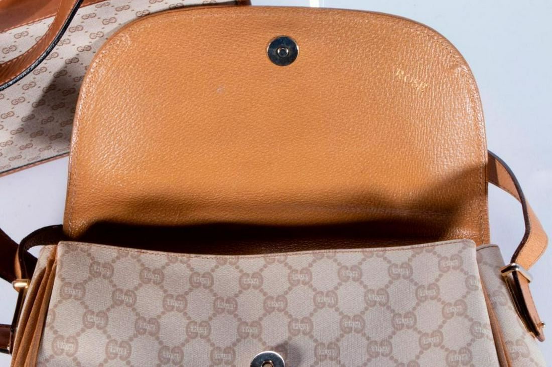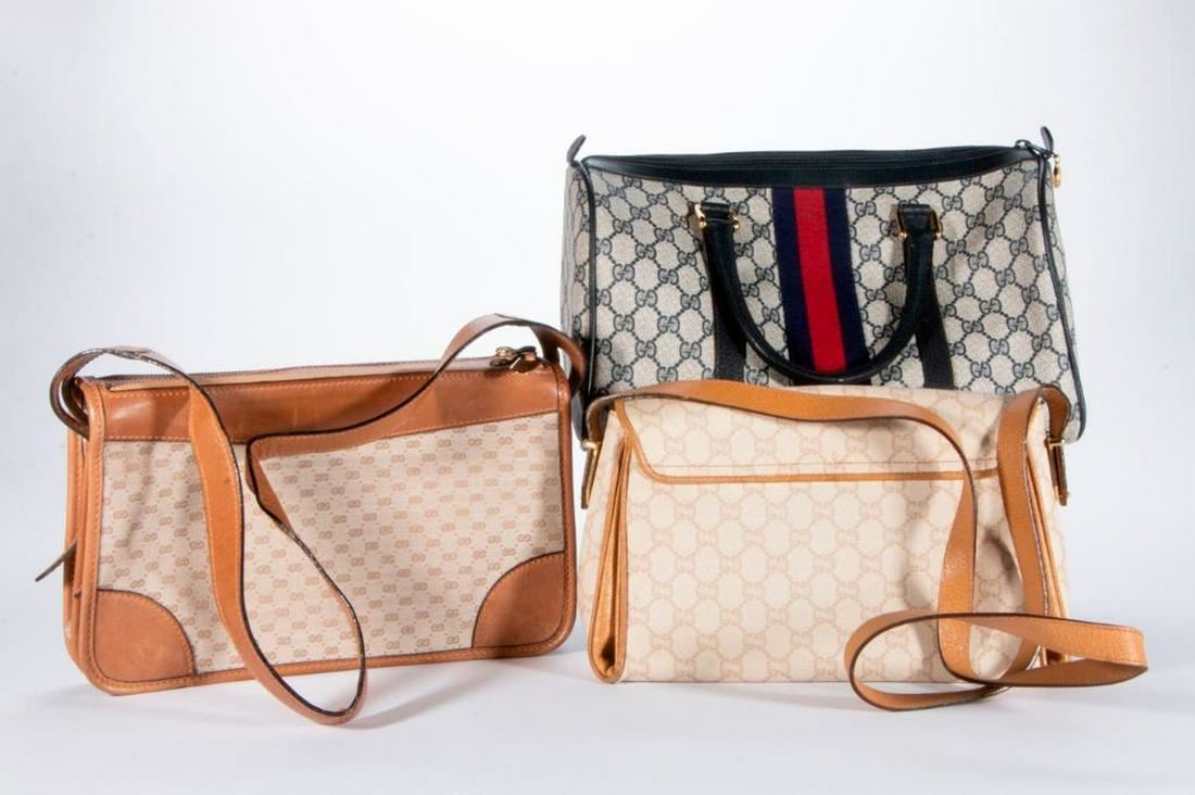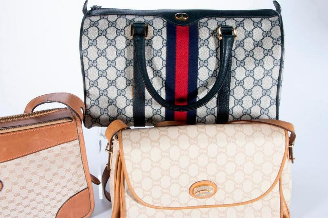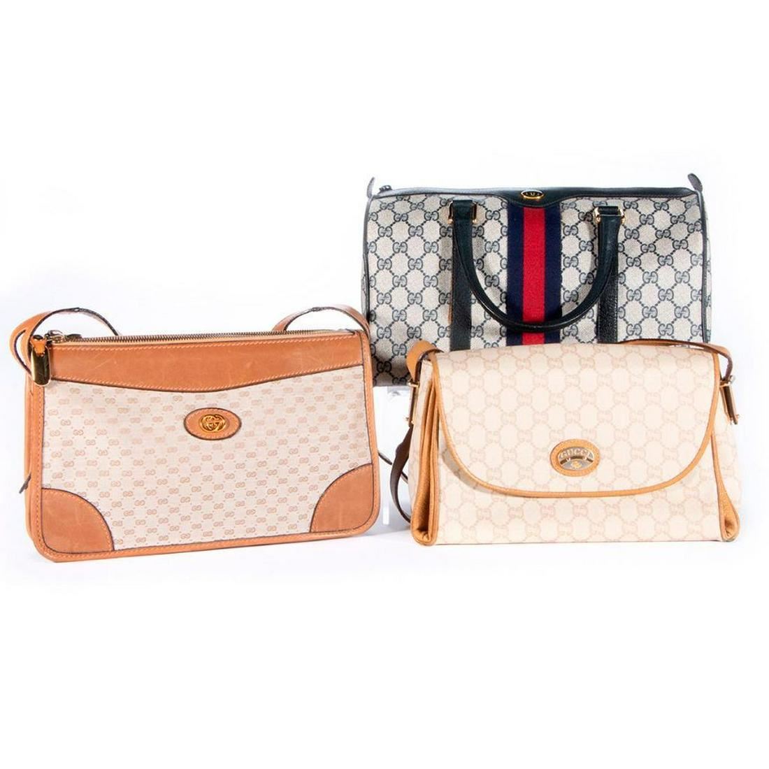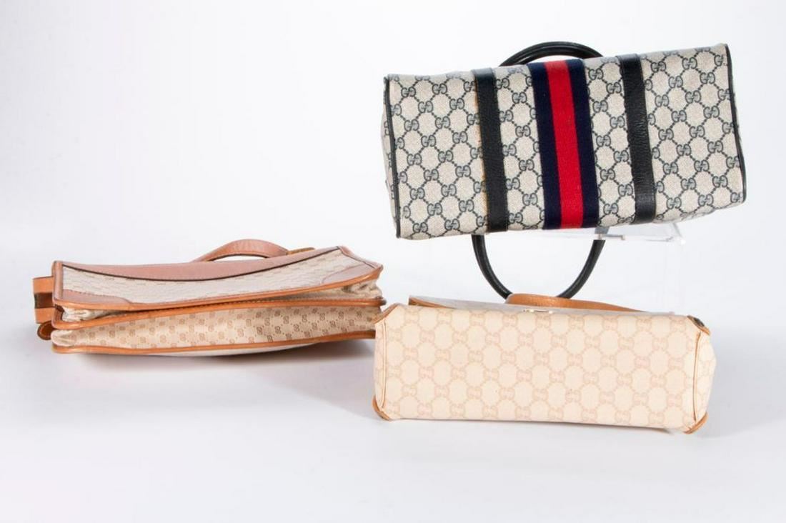 coated canvas with blue/red stripe: 13 x 6 x 7.5in; tan leather and canvas: 12 x 2 x 7in; beige Gucci Plus: 12 x 4 x 7in; all very good condition Items are sold as is. Please inquire about condition if not otherwise stated.