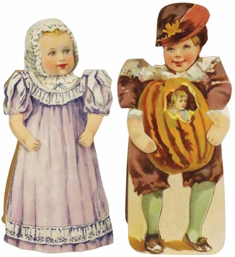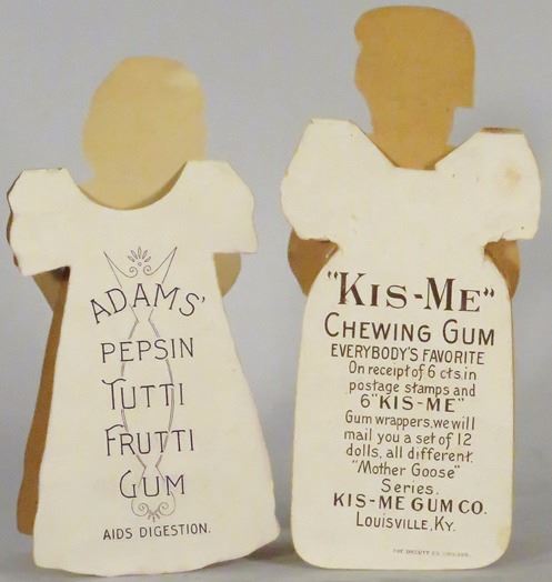 Two Kiss-Me and Adams Tutti-Frutti Gum Die Cut Paper Trade Cards. Near mint condition. Aprox 5 1/2 inches tall.