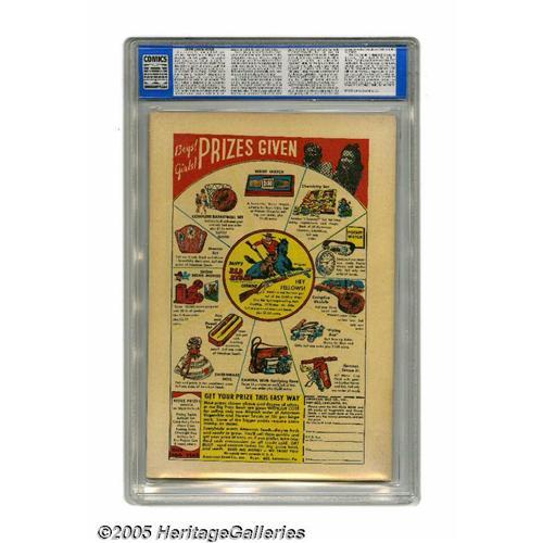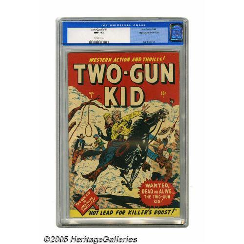 <B>Two-Gun Kid #1 Mile High pedigree (Atlas, 1948) CGC NM- 9.2 Off-white pages.</B></I> The first Marvel Western comic book was this one right here, with the first appearance of the Two-Gun Kid. The various incarnations of the Kid were very good to Atlas/Marvel, with his title in publication on and off all the way up until the late 1970s. This is the best copy you'll find of this #1 issue; it's the only one graded above 7.5 by CGC to date. The cover and interior art are by Syd Shores. Overstreet 2005 NM- 9.2 value = $1,400. CGC census 9/05: 1 in 9.2, none higher. <BR><BR><B>Important notice:</B> Heritage usually auctions material at the rate of 200-250 lots per hour. On some occasions eBay Live bid software or the Internet may not be able to keep up with the pace of the auction. We recommend placing a realistic absentee bid now as insurance to avoid disappointment. Occasionally the auctioneer may eliminate or reject an eBay Live bid, and the auctioneer may also reopen a lot after the close of the eBay live bidding (usually because we missed an audience bid), and may reject your bid even if it shows you as the winning bidder. By bidding via eBay Live, you agree that Heritage may award the lot to another bidder at its sole discretion under the circumstances described above or any other reasonable circumstances. Since eBay bids are not shown to us until we open the lot on the floor, we treat those bids just like floor bids. In most cases the floor responds before the eBay bid is presented to us, due to Internet lag time, so for consistency we have made it a policy that floor bids are always considered first over tie eBay live bids. Also please note that all Heritage lots purchased through eBay Live carry a 20% Buyer's Premium. Please make sure you read the Terms and Conditions before you bid. This lot is being auctioned in conjunction with a live floor auction by Heritage Galleries & Auctioneers. All final auction and invoice information will be supplied by Heritage Ga