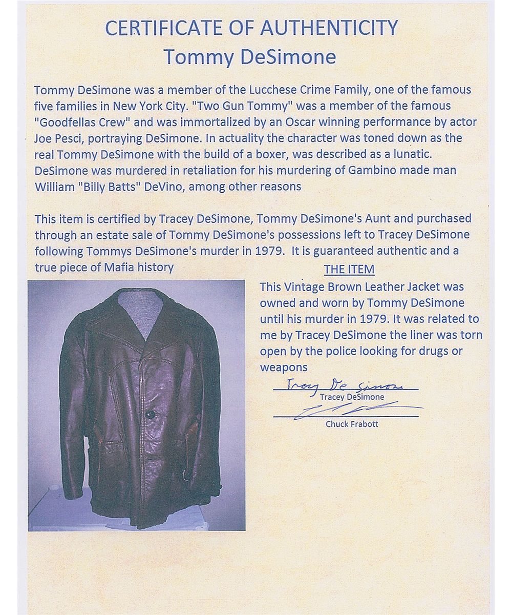 Associate of the Lucchese crime family in New York (1950–1979) involved in truck hijackings, dealing and fencing of stolen property, extortion, fraud, and murder. He was immortalized in an Oscar-winning performance by Joe Pesci in Goodfellas as Tommy DeVito, a character based on DeSimone. It is believed that DeSimone was murdered in 1979 as a reprisal for having murdered two close friends of John Gotti, and his body was only recently found. DeSimone’s personally-owned and -worn brown leather jacket, size 46, with the inner lining torn apart by the police when searching for drugs and weapons. Accompanied by a color copy of a certificate of authenticity from Tracey DeSimone, Tommy’s aunt who inherited most of his possessions.