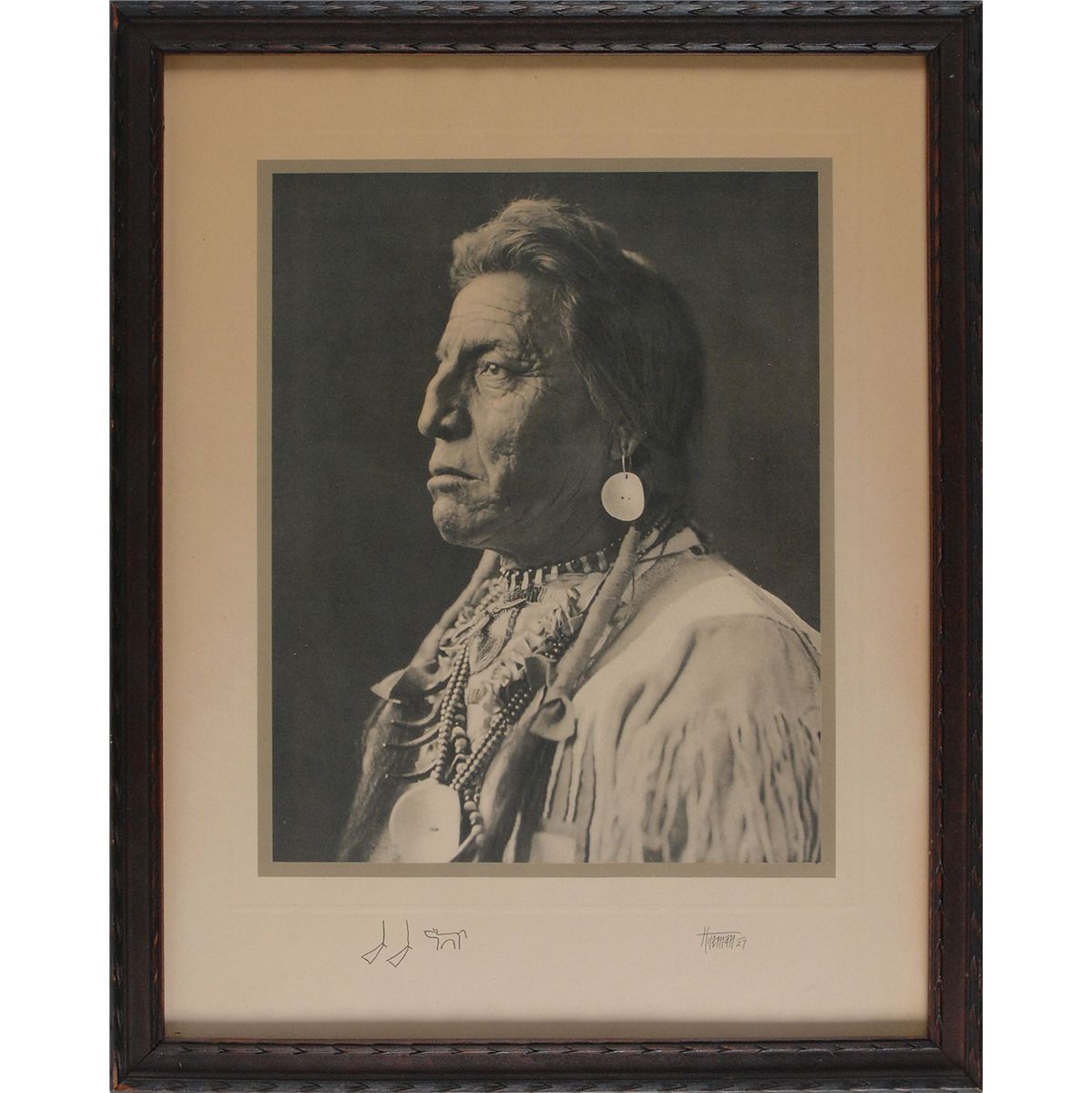Blackfoot chief (1872–1934) best known for the durable though still-controversial claim that he served as one of models for sculptor James Earle Fraser in creating the composite Native American portrait on the ‘Buffalo’ nickel. Unsigned vintage printed 7.5 x 9.5 cardstock portrait of Two Guns White Calf in full Native American dress affixed to a 10.5 x 13.5 mount bearing pre-printed signatures. Framed to an overall size of 12 x 15. In fine condition.