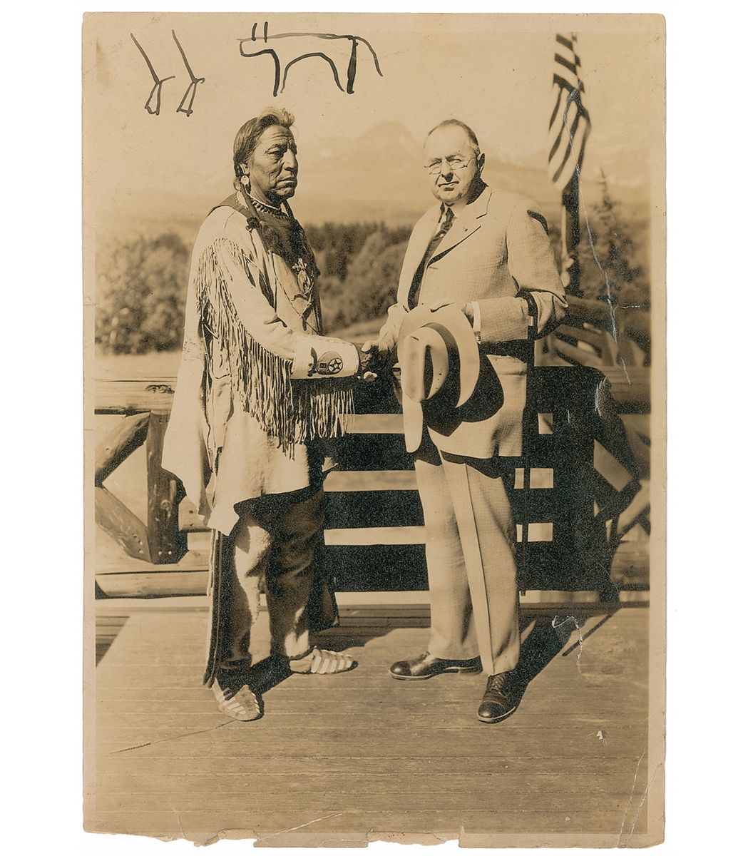 Blackfoot chief (1872–1934) best known for the durable though still-controversial claim that he served as one of models for sculptor James Earle Fraser in creating the composite Native American portrait on the ‘Buffalo’ nickel. Desirable matte-finish 4.75 x 6.75 photo of the famous chief in traditional clothing, shaking hands with a man in a suit, signed in the upper left in black ink with his great three-character pictogram of two rifles and a horned calf. In very good condition, with scattered creases (primarily to edges), chipping to bottom edge, a couple small punctures to lower right, and silvering to dark areas of the image. A great full-length image of the iconic American Indian.