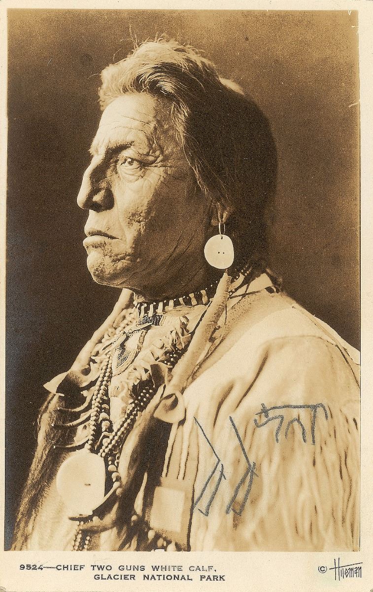 Vintage 3.5 x 5.25 postcard photo of Two Guns White Calf in near-profile, signed in pencil with his three-character pictogram of two rifles and a horned calf. In fine condition.
