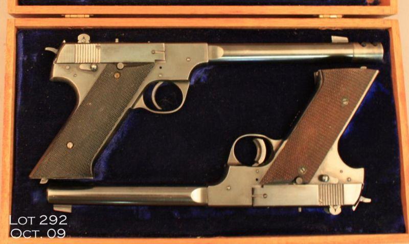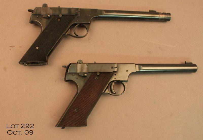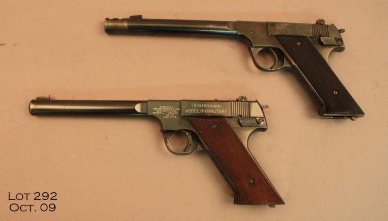 Two HI-STANDARD Model H-D Military pistols; the first, #188371, .22 LR, blued finish, 6 ¾” barrel, adjustable sights, checkered walnut grips. Pistol is in very good to excellent overall, with approximately 85% original finish, Blue isthinning on the barrel and high points, and some loss at the muzzle. Grips are near excellent with just slight mars. The second pistol is #151349, .22 LR., blued finish, 6 ¾” barrel with compensator, adjustable sights, checkered plasticgrips. This pistol is in very good condition with approximately 70% original blue, most of the bluing is gone from the compensator. Otherwise minor scratches on the front strap and to the rear of the trigger guard. The pistols are in ageneric wooden presentation case with dark blue felt, which is in good condition, but has numerous scratches in the finish and the top liner is about 1½” undersized. Est. $1,250-$2,500.