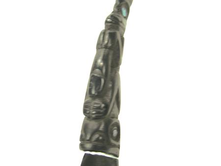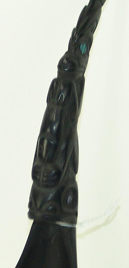 Circa Early/Mid 1900s, Pair of fine goat horn spoons each with a handle of carved totemic form and inlaid shell. Both very good condition. 8-1/2" x 3" each From the Johnson Collection.