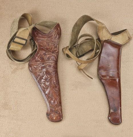 Two Haiser-marked vintage shoulder-holsters. One carved, on plain. Carved example shows original straps and fits 5-1/2”Colt single action well. Second holster fits a medium frame 6” Smith & Wesson, M&P type. Also includes of two leather shot flasks, one with game scenes, fair condition, some typical leather aging. Mid 19th century. From the Howard Bud" Goebel collection. Est: $300 - $600"