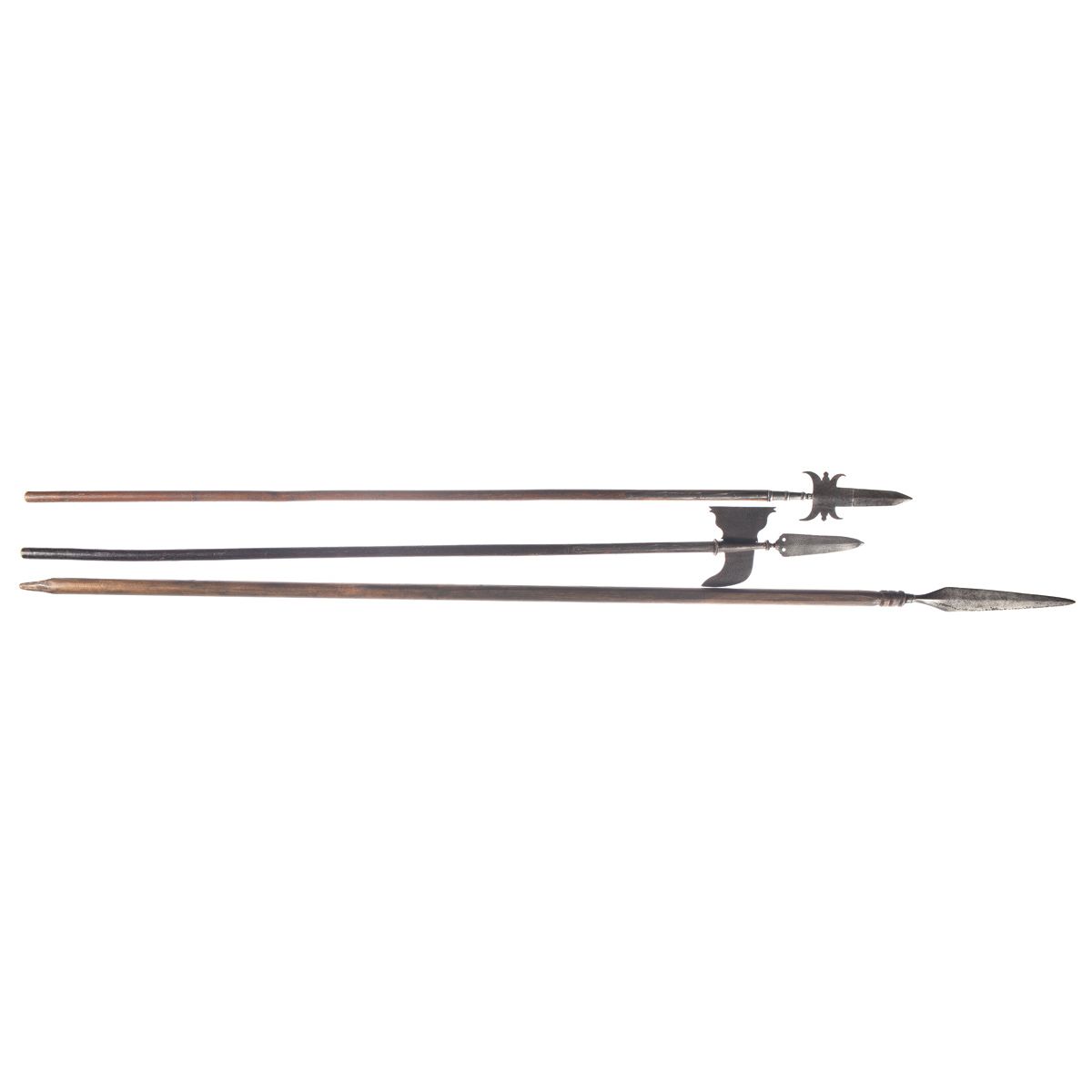 German halberd circa 1760-80, 78 3/4" long (good, with some pitting on the cleaned metal). English infantry halberd circa 1740-80, 75" long (fair with pitted metal). American spontoon, 94" long (good, with some pitting on the spear).