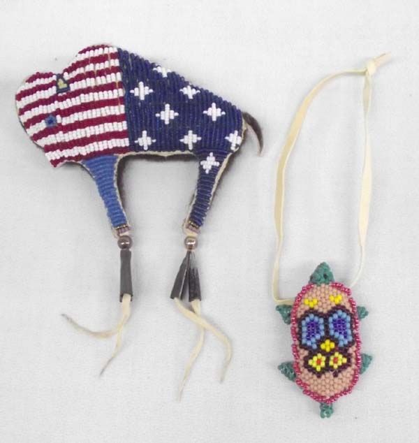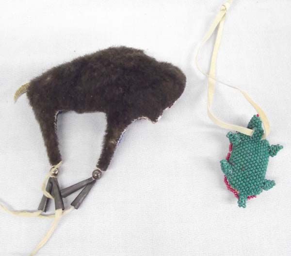 Two Hand Beaded Animal Fetishes. One turtle or armadillo, and one bison beaded on one side and real bison hair on the other side. The bison feet have cone charms to make a pleasant sound. The Bison is 4.5''H and 4''W. Much work went into the making of these fetishes.