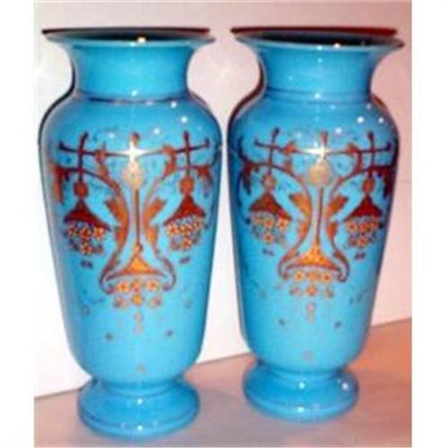 We are offering you two (2) FANTASTIC Footed Hand Blown, Hand Painted, Blue Bristol Footed Vases all for one money. EAch vase is in SUPERIOR condition with no chips, cracks, or dings but does have some decoration wear. Each vase is quite large and measures 5" in diameter and stands a very stately 11.75" tall.