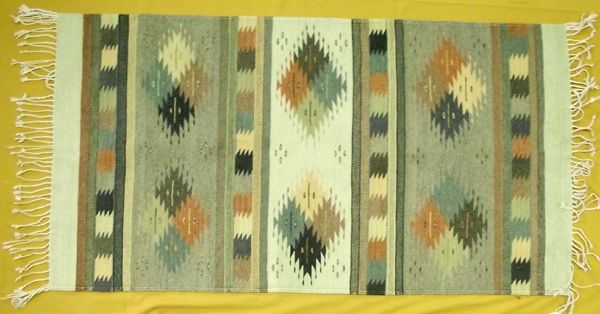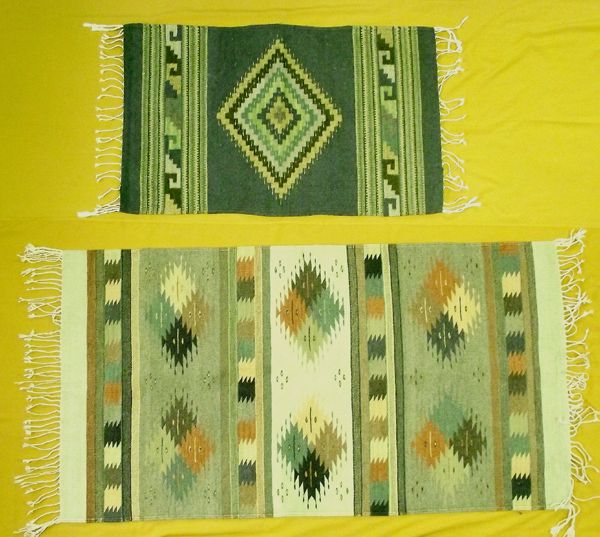 Two Hand Woven Chimayo, Rio Grande Style Wool Rugs. These wonderful rugs are muted earth tone colors and have striking intricate designs. The largest measures approx. 58''L x 31''W while the smaller rug is 38''L x 23''W.