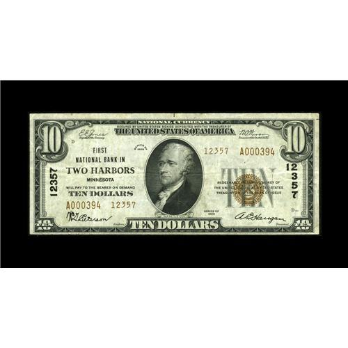 <B>Two Harbors, MN</B></I> - $10 1929 Ty. 2 <B>First NB</B></I> Ch. # 12357<BR>A nice title graces this attractive small size note. Expect this <B>Very Fine</B></I> example to sell in the range of...