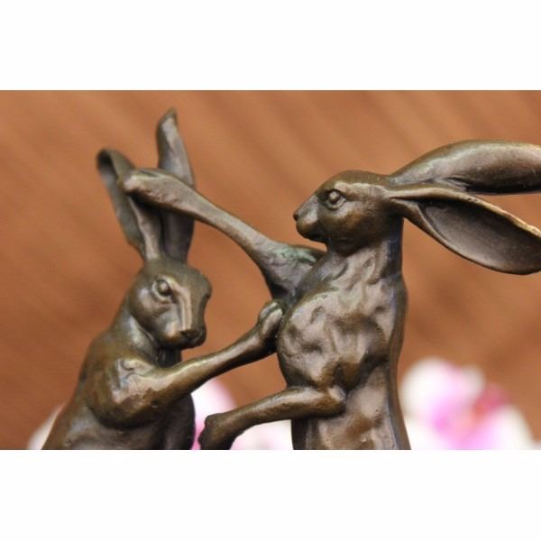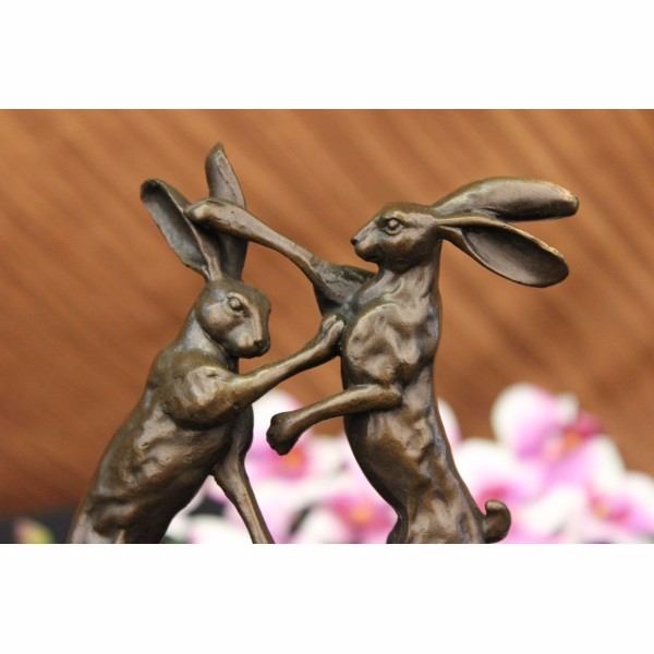 Representing in a long list of fictional stories the hare is a normally a shy animal. In this sculpture the shyness evades the two hares as they fight with each other. The hares stand on the hind legs swatting one another with their front legs in this playful or aggressive action. Their long ears extend outwards. This sculpture is lovely addition piece for animal lovers. The sculpture stands on an impressive olive and black marble base. Bronze dimensions with marble base: Height 10 X Width 5 inches. Weight: 7 lbs.