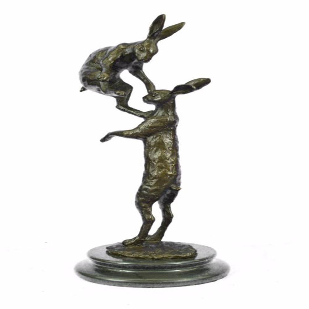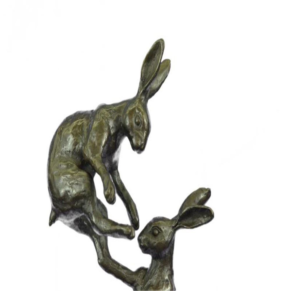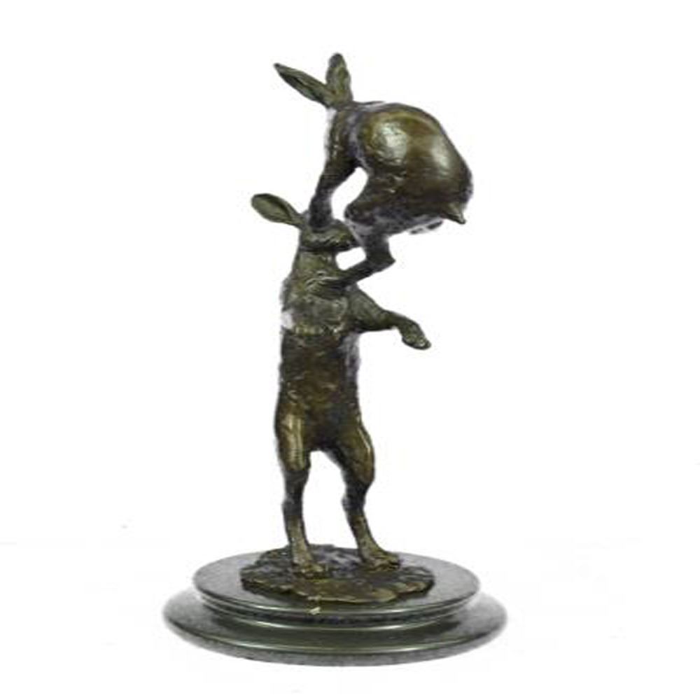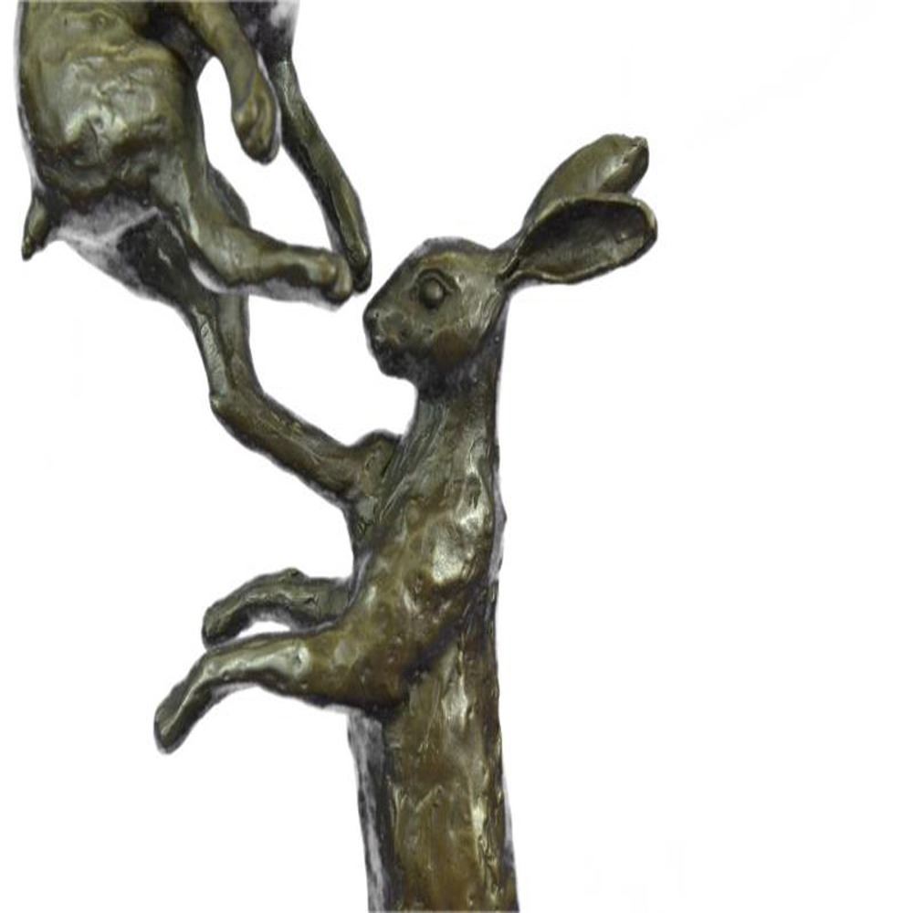 Representing In A Long List Of Fictional Stories The Hare Is A Normally A Shy Animal. In This Sculpture The Shyness Evades The Two Hares As They Fight With Each Other. The Hares Stand On The Their Hind Legs Swatting One Another With Their Front Legs In This Playful Or Aggressive Action. Their Long Ears Extend Outwards. This Sculpture Is Lovely Addition Piece For Animal Lovers. The Sculpture Stands On a Black Marble Base. Bronze Dimensions with Marble Base: Height 14 X Width 6 inches. Weight: 7 LBS.