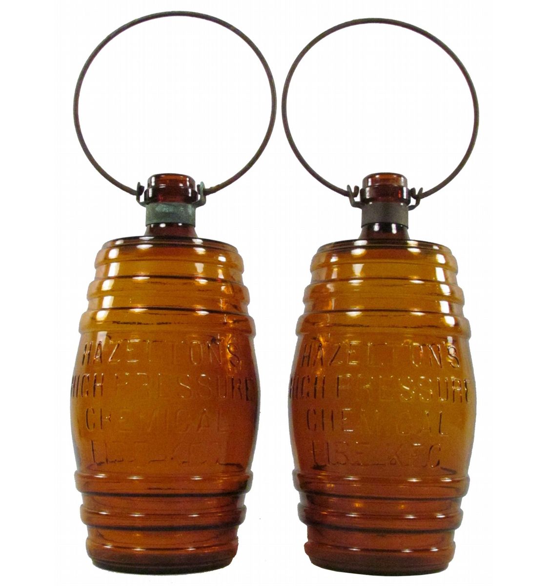 Two Hazelton High Pressure Fire Keg. Barrel shaped with hoops. Large metal ring fastened to neck for carrying. Amber glass, half gallon size. Each measures 11 inches tall.
