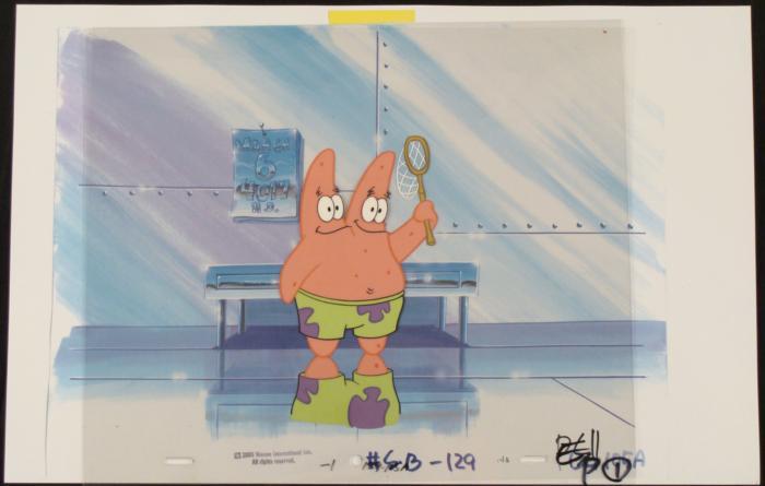 This animation cel and reproduction background are from the Nickelodeon TV show SpongeBob Squarepants. The story takes place under the deep blue sea in Bikini Bottom, where SpongeBob resides. SpongeBob, who is a yellow, porous sponge, is your typical happy-go-lucky character, as he is always cheerful and enjoys making people laugh. Patrick Star, SpongeBob's neighbor who is a starfish, is your average children's show idiot, as he boasts knowing nothing and is often getting himself into ridiculous situations. Between the homes of these two lies the home of the miserable Squidward, a squid, who is known for being grouchy and playing tricks on SpongeBob and Patrick. Both SpongeBob and Squidward work at the Krusty Krab, a fast food business run by the greedy money-loving Mr. Krabs, a crab, the arch rival of the evil, possibly misunderstood, Plankton. Another neighbor, Sandy Cheeks, an athletic squirrel who normally wears an astronaut's space suit, was introduced in "Tea at the Treedome." She spends most of her time inventing and experimenting. This is Patrick in year 4011 A.D.Original Printed Background and Animated Cel Overall Size of Background: 10 1/2" x 17" Overall Size of the Cel: 10 1/2" x 12 1/2" Very good condition This is an original hand-painted cel set-up used in the production of an episode of "SpongeBob SquarePants." Each one-of-a-kind set-up represents a slight change in position of the characters. When individually photographed and projected in rapid succession, the images appear to move.