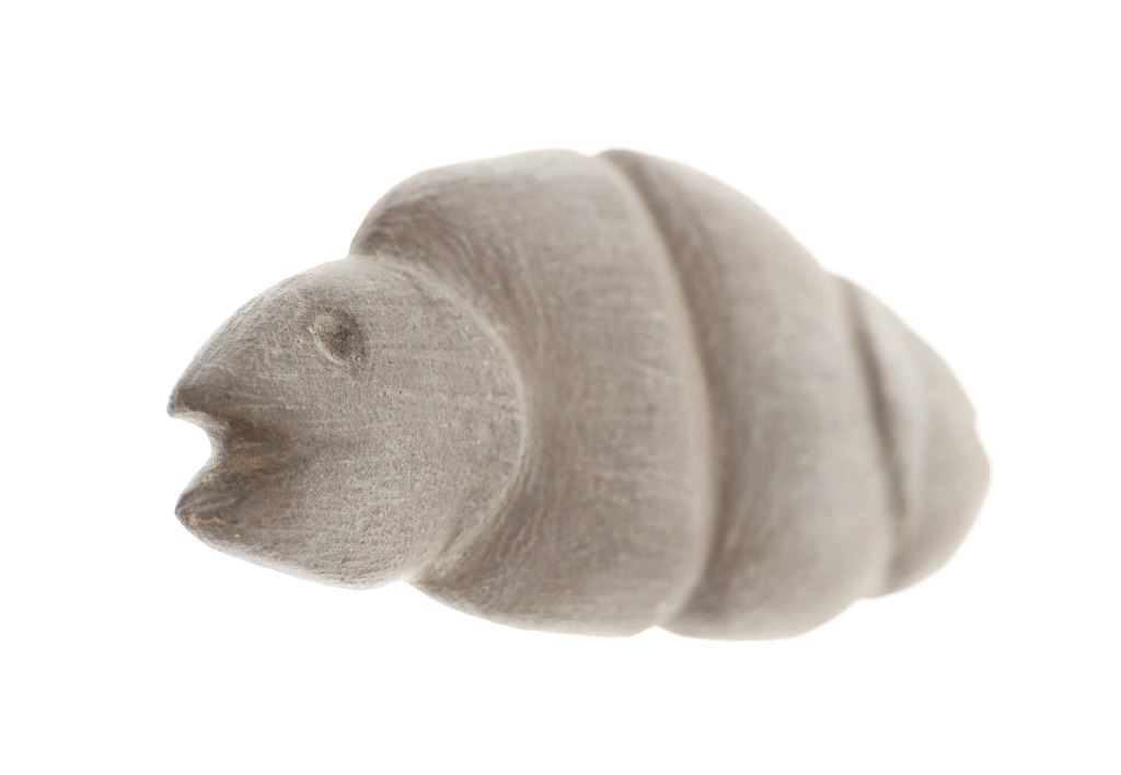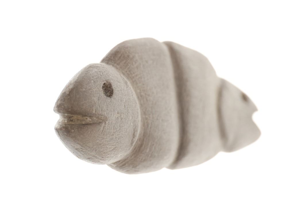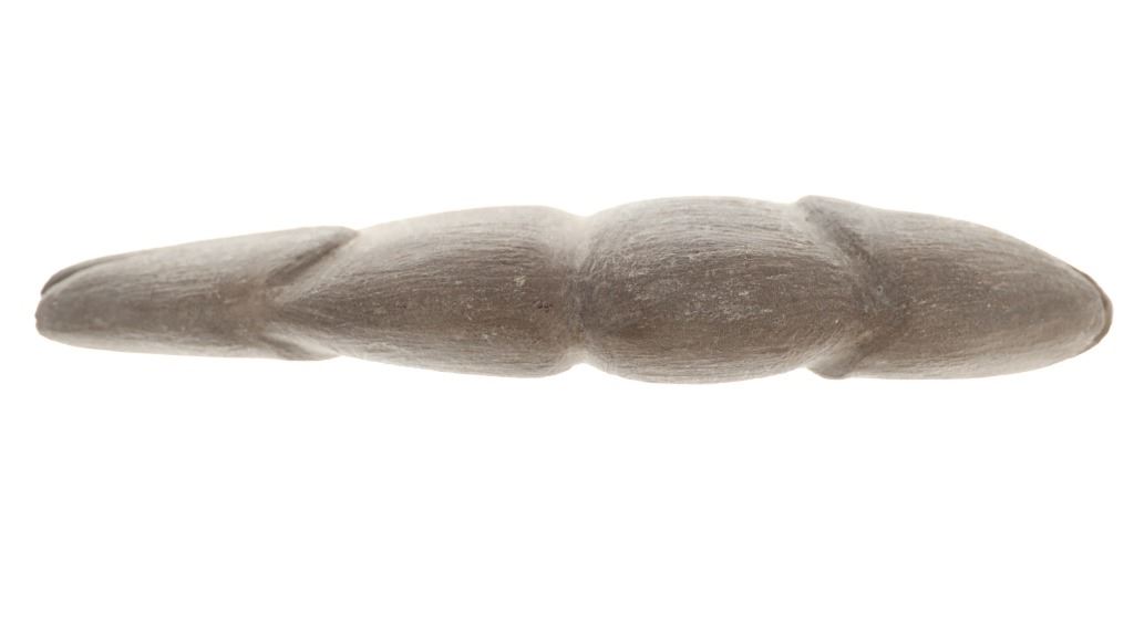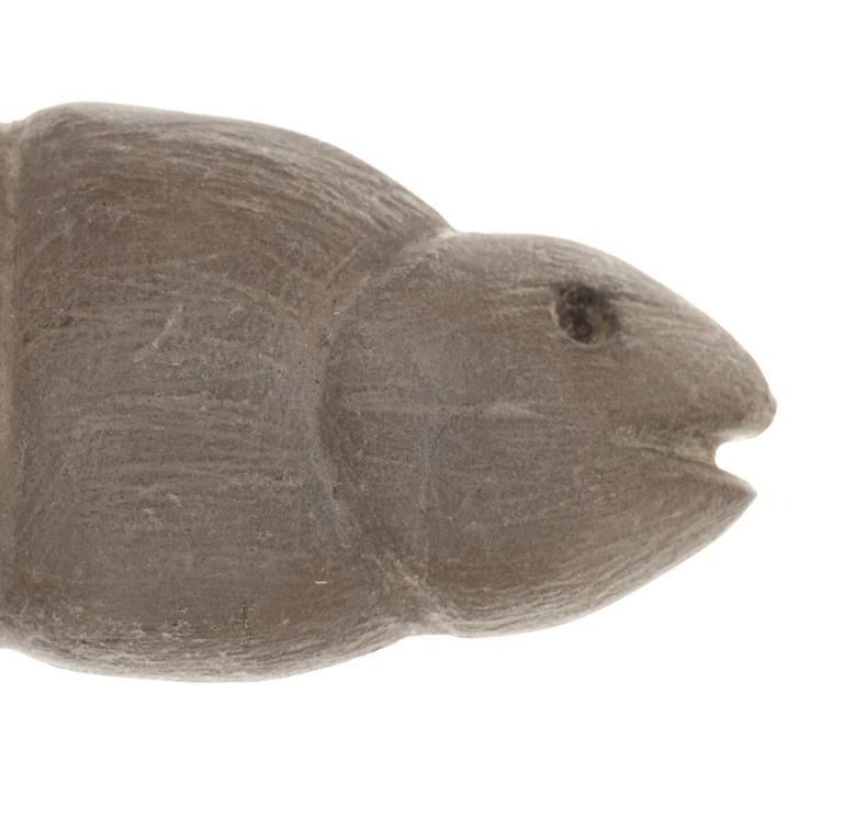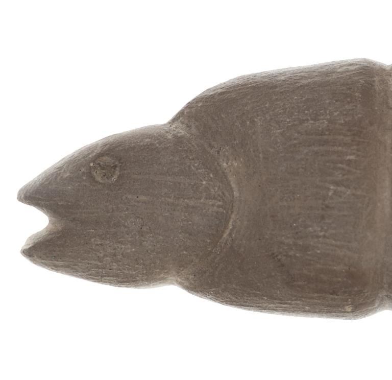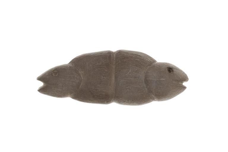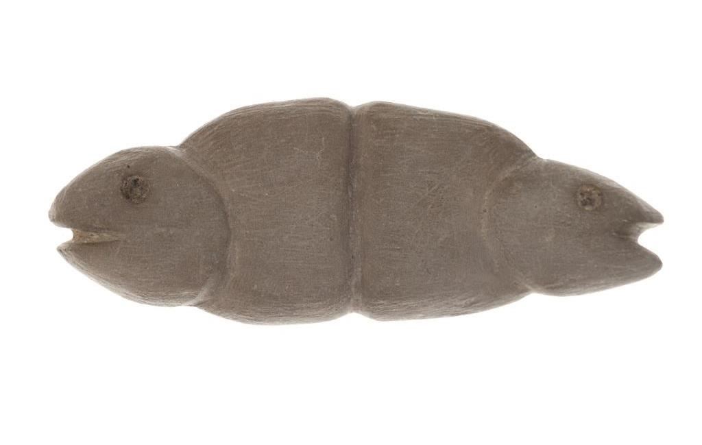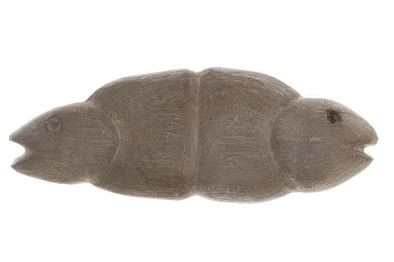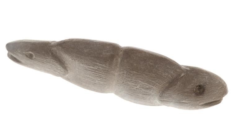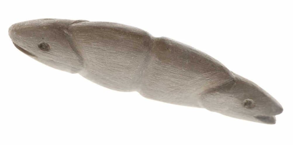 Featured in this lot is this two-headed Pisces fish river rock carving. The carving features a wonderfully and professionally crafted river rock construction that shows a two-headed fish that shows the carving to be hand carved. The condition of this carved river rock is we preserved with score marks from carving but otherwise shows well preserved condition. The measurements of this river rock carving is 2 7/8" x 7 7/8" x 1 1/4". The collective weight of this rock carving is 14oz.