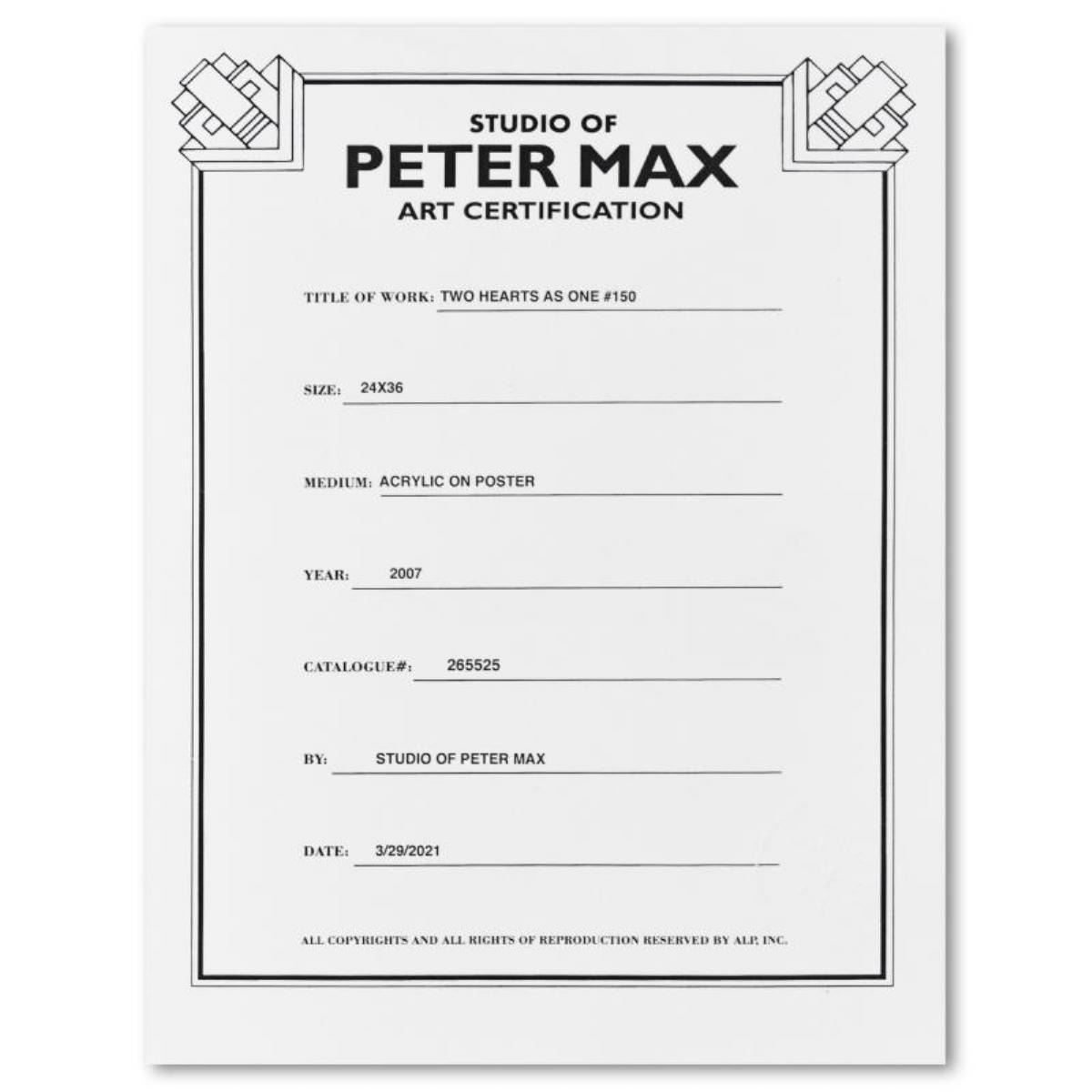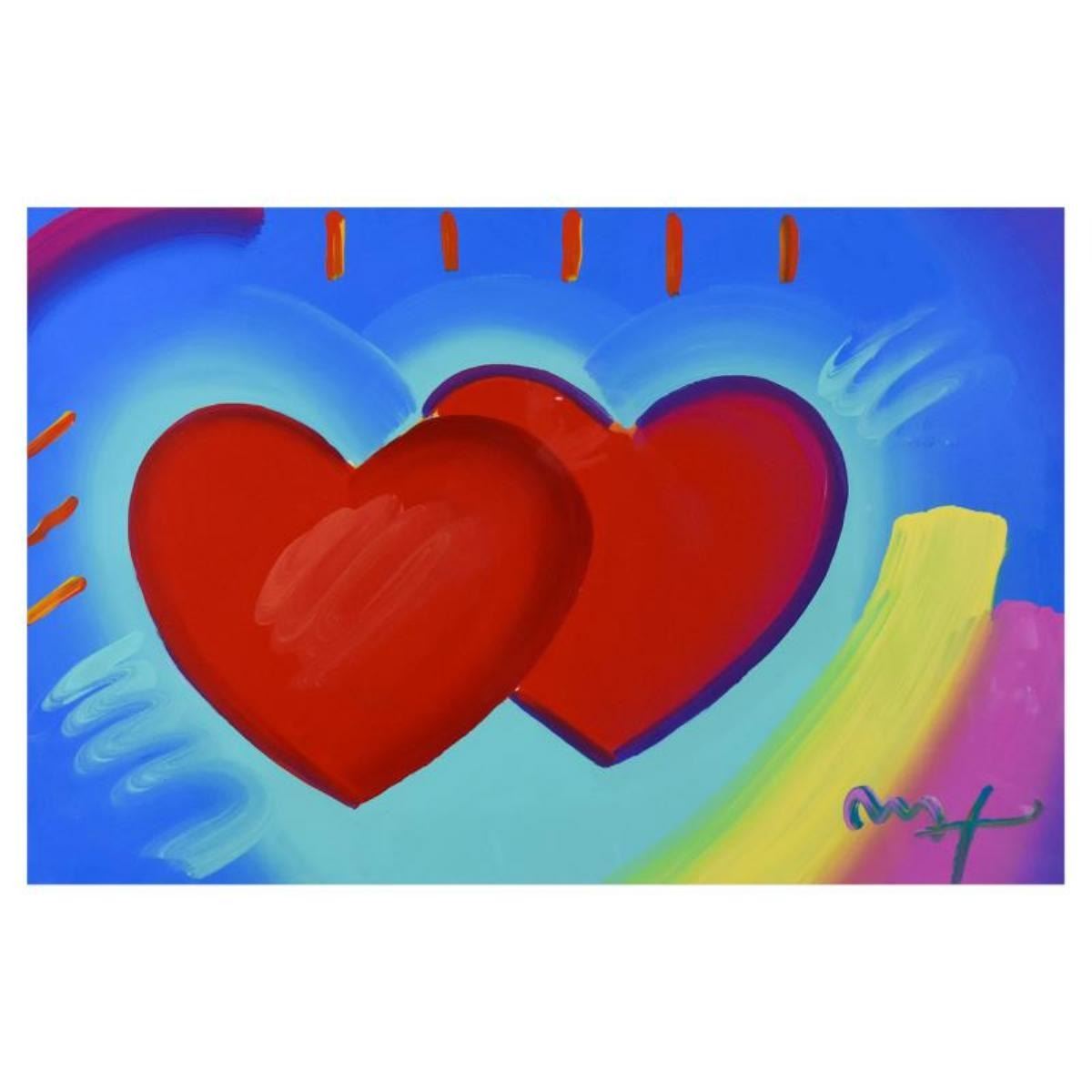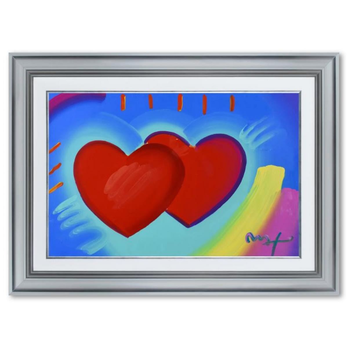 Two Hearts As One by Peter Max. "Two Hearts As One" is a one-of-a-kind acrylic mixed media on paper, hand signed by Peter Max. This piece comes custom framed. Includes Certificate of Authenticity from Peter Max Studios! Measures approx. 47" x 35" (with frame), 35" x 23" (image).
