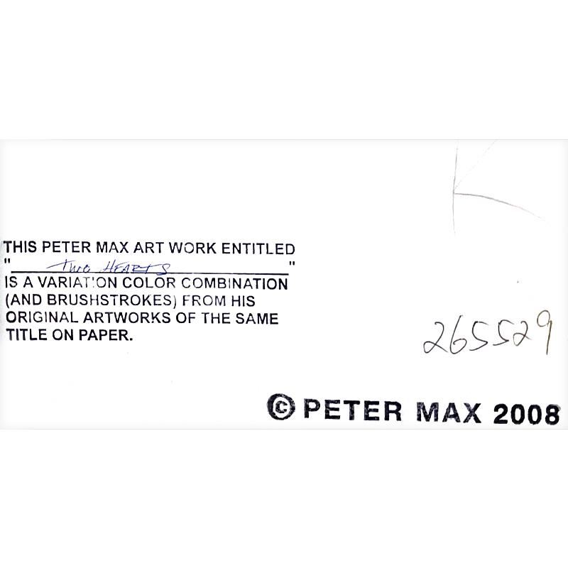 "Two Hearts" is a one-of-a-kind acrylic mixed media on paper, hand signed by Peter Max. This piece comes custom framed. On the reverse side of this piece there is a registration number (265529) from Peter Max Studios certifying authenticity. Measures appr
