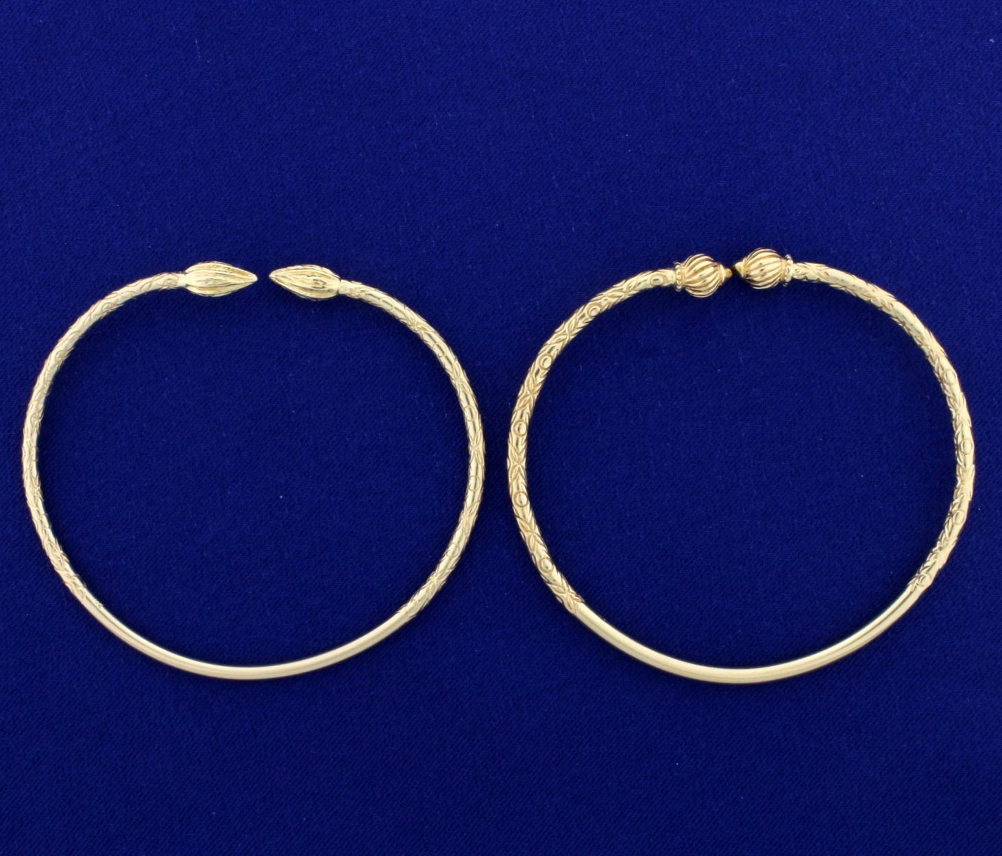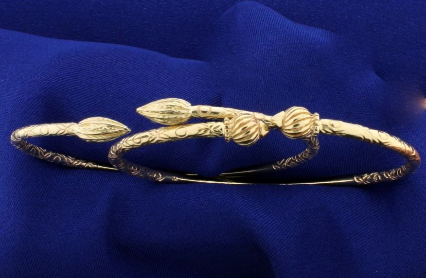 In 14k yellow gold. Bright yellow color looks like 18k gold. Inside dimensions approximately 2 3/8"x2.8". Unique twist design, etched on front and sides. Includes two bracelets. 30.1g.