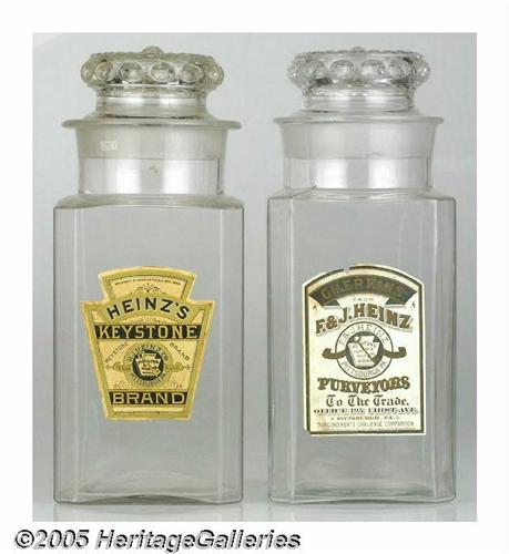 <B>Two Heinz Labeled Glass Jars with Ground Lids</B></I> These two early 1880s Heinz jars are in excellent condition. Approximately 11 1/4" tall with original lids, one jar sports the rarer F. & J. Heinz label which is dated 1885. The jars are in excellent condition with minor nicks around the edges of the lids. The F. & J. Heinz label shows more dirt and a small tear along the top edge. Nicely representing the early containers used by the Heinz company. Lot:252