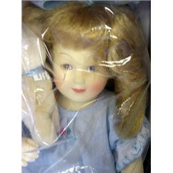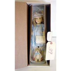 "Goldy Locks" by Bessie Pease Gurmann. These two porcelain "Goldy Locks" are an inspired Heirloom Tradition Collectible Doll. They are approximately 12 inches and are wearing a solid blue dress accented with blue and pink flowers at the neck and lace trim on the sleeves. They are also wearing white pantaloons trimmed in lace with white socks and pink shoes. "Goldy Locks" has her own teddy bear with her. They each have their own stand and are in their original box and wrappings. They are in excellent condition.