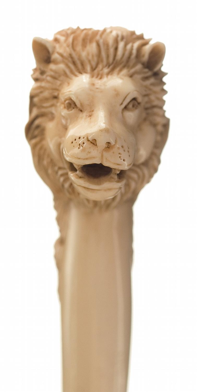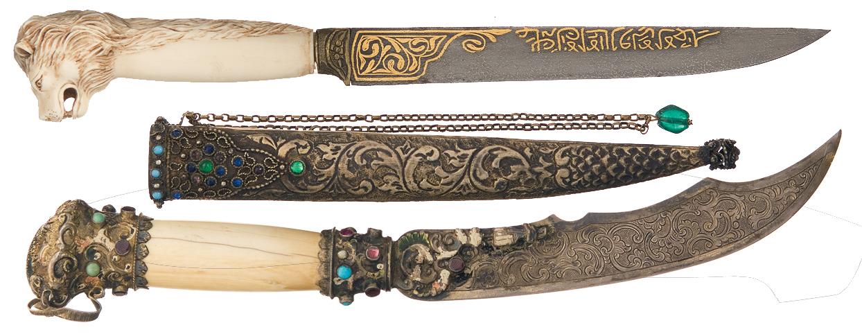 1) Gold inlaid knife, 5" straight blade with engraved brass panels on the ricasso, a 1 7/10" panel on either side of the blade ahead of the ricasso, and a 2 1/10" section of untranslated writing on the right side of the blade. Ivory grip, 3" long, with a carved lion head on the pommel and carved fur running along the back to the blade. OAL: 8 1/4" With a silver finished and heavily engraved sheath, further accented with semi-precious stones. 2) Fancy silver finished and engraved knife, 5 1/4" silver finished blade, with scroll engraving and raised designs of armed men standing on scrollwork with blue, white and green enamel accents and a small purple gem on each side. Smooth one piece ivory grip, with a lizard design on the pommel and gemstones and enamel accents on both the collar and pommel. OAL: 9 1/2"
