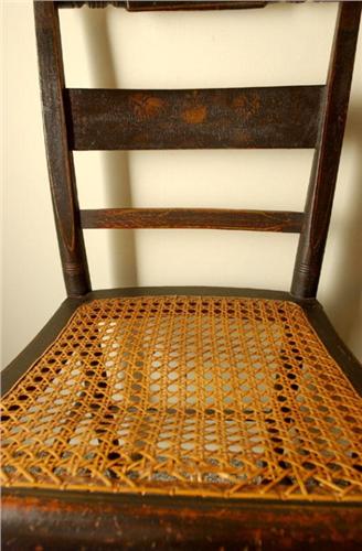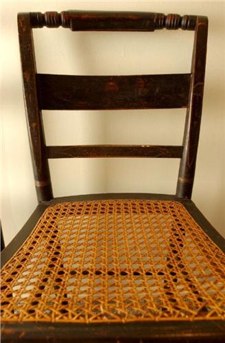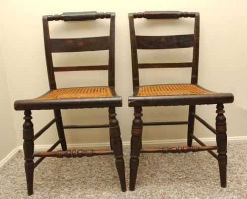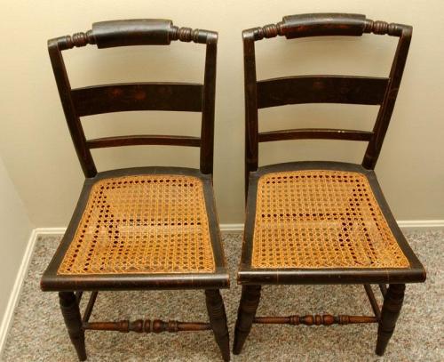 Set of 2 Antique Hitchcock-style chairs with cane seating and pillow backs, painted black, some damage to cane, 32 1/2" by 15" by 15 3/4"