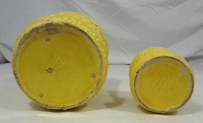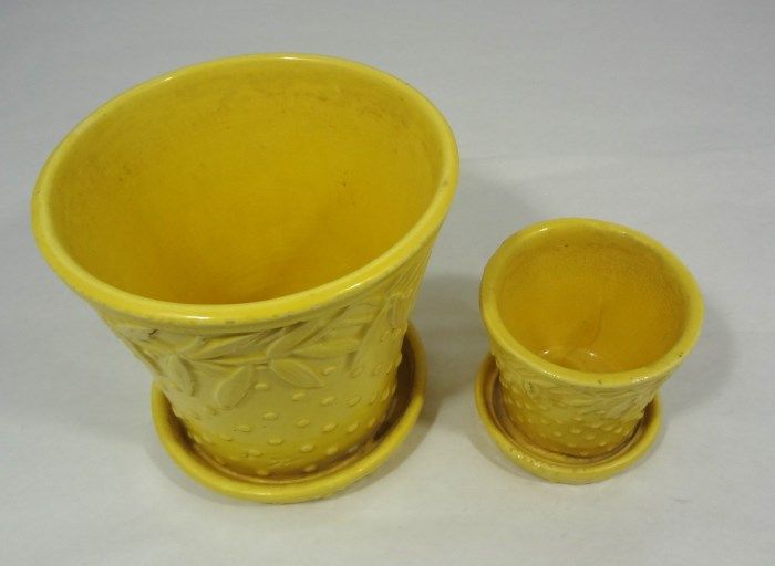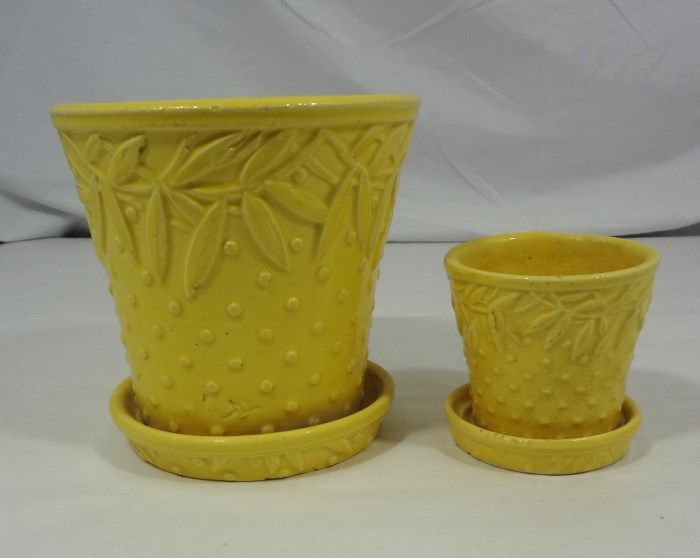 Two signed McCoy Hobnail and Leaves pots and saucers. One pot measures approximately 4" and the larger is 6". These pieces are also found in Warman's "McCoy Pottery" book on pages 88 and 89. Est Value $50.00-70.00