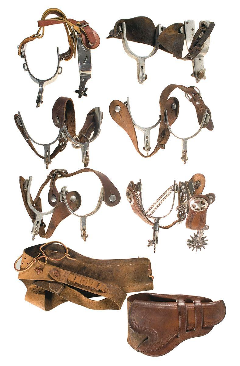 Lot includes a faintly marked "V.L.&A./ CHICAGO" marked belt holster, shoulder holster of unknown make, and 6 pairs of spurs, including a pair of silver accented, engraved E. Garcia spurs. The Garcia spurs are excellent, with the rest of the items in fine or better condition.