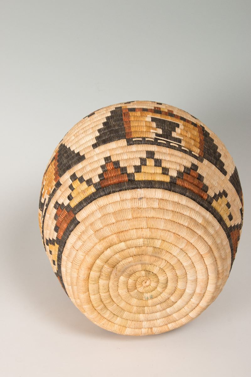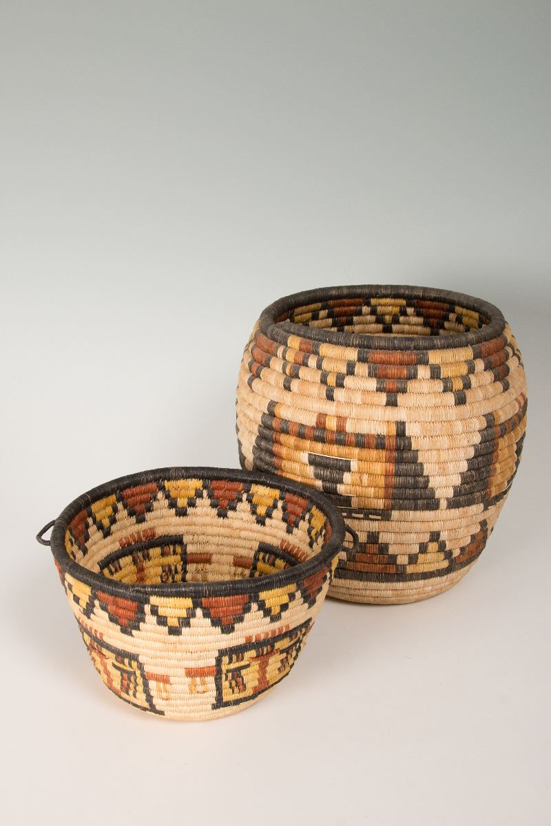 Two Hopi Coiled Baskets. 1) 9" x 9 ½" polychrome basket. 2) 5" x 7 ¾" polychrome basket. Both circa 1960s.