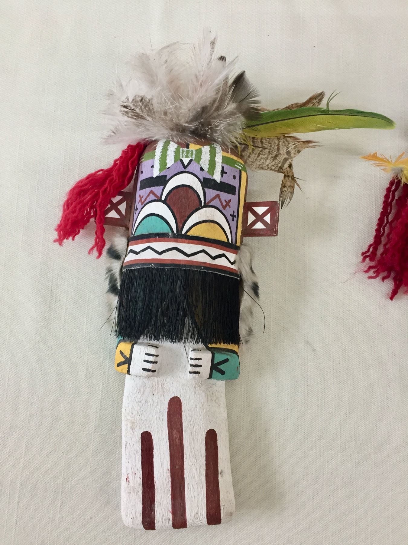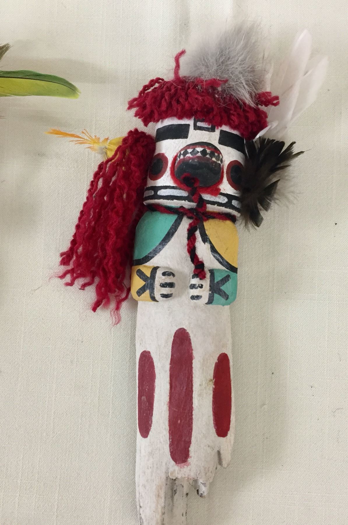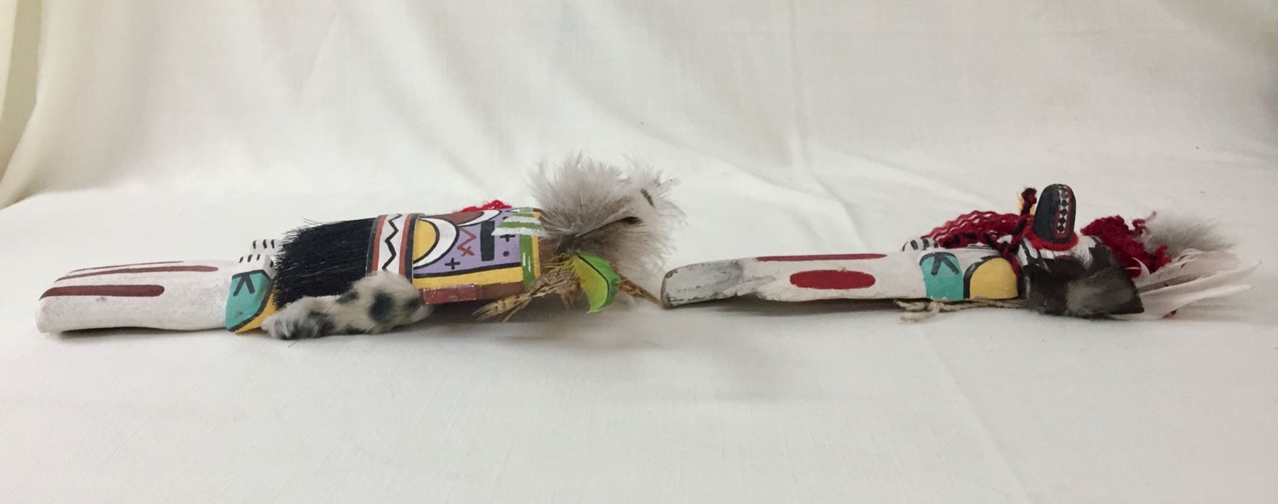 Description: Presented for sale in this lot are two Hopi Flat Dolls created by the known artist, John David Sr. These dolls have been hand painted and accented with feathers, yarn and horsehair and are in new condition. Maker: John David Sr., Hopi. Approx. Age: New. Size: 4-1/2”w x 8-1/2” long and 2-1/4”w x 8-1/2” tall. Condition: New, brought in by the artist. Please look closely at the pictures - they are an important part of our description. Shipping: There will be a $8 handling / packaging fee for shipping this lot. The actual cost of postage will be added on top of that.