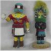 From the collection of Nick & Suzanne Nicholas. Two Hopi Kachinas, the larger measures 8''h and has a tag, ''Rattle Kachina'' by Francis Duwahoya and has some damage, missing the rattle and top piece. The second piece with yellow feathers measures 8.5''h x 3''w.